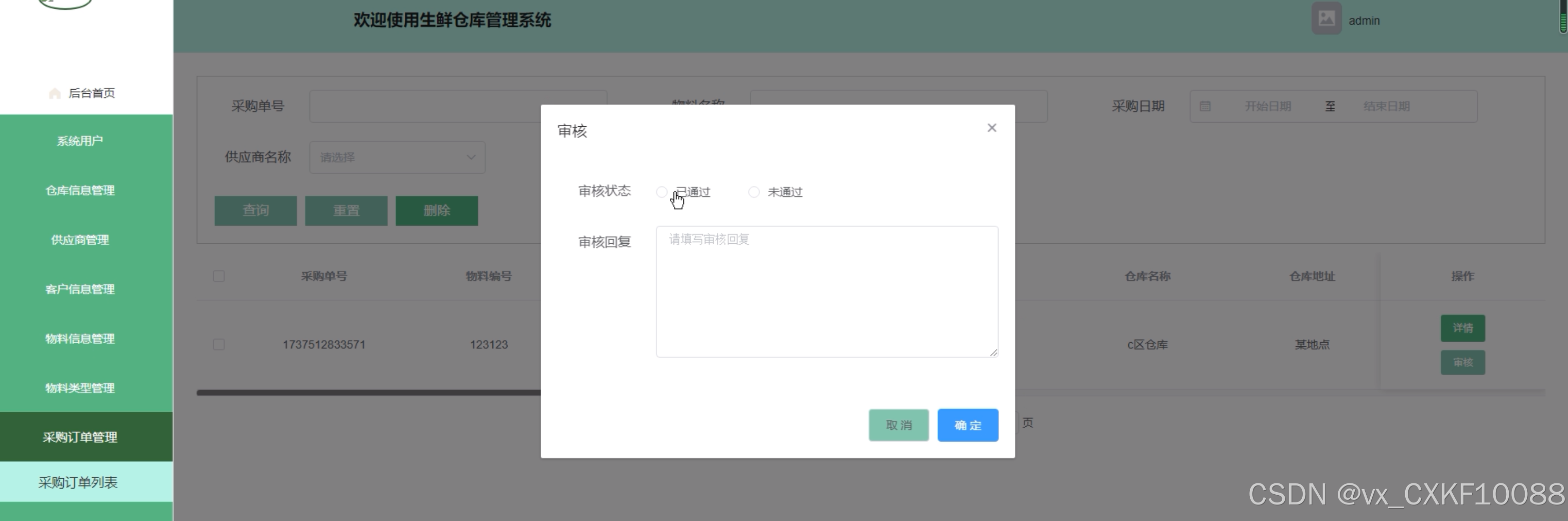 (9)采购订单管理:管理员点击可查看采购订单列表,可对采购员添加的采购信息进行审核回复。审核通过后可点击“确认入库”按钮添加入库信息。
