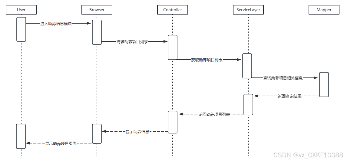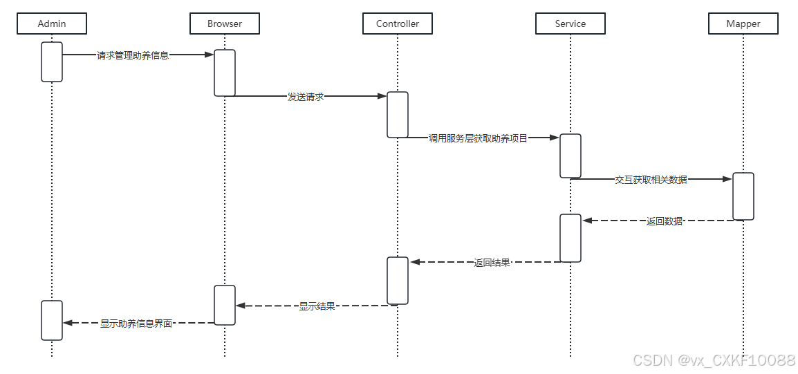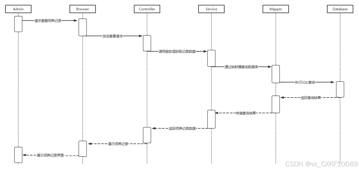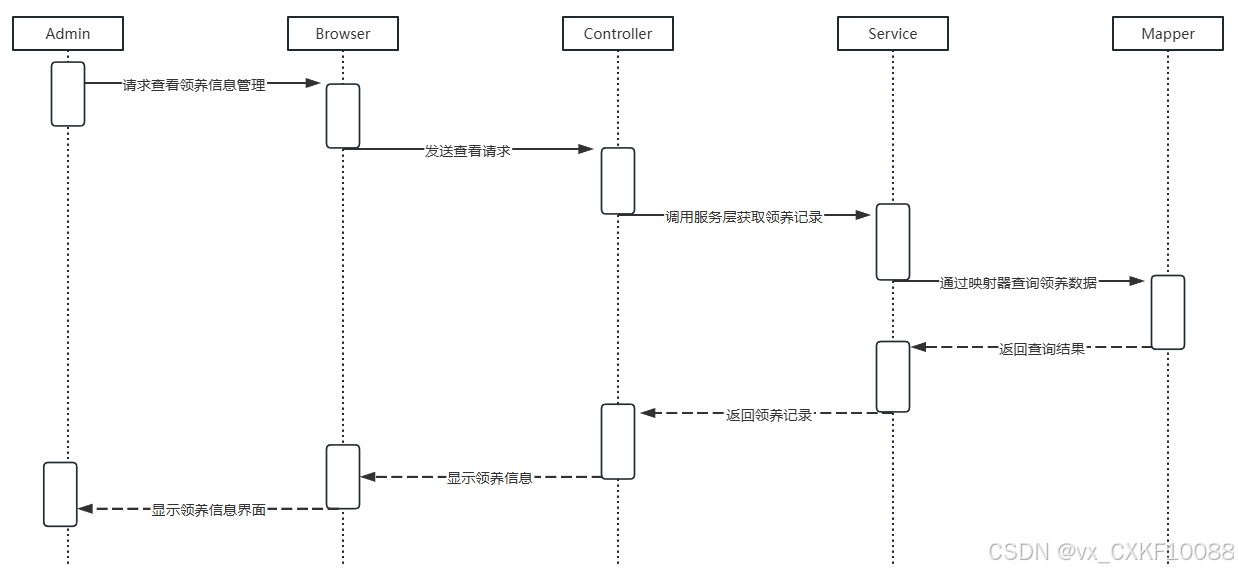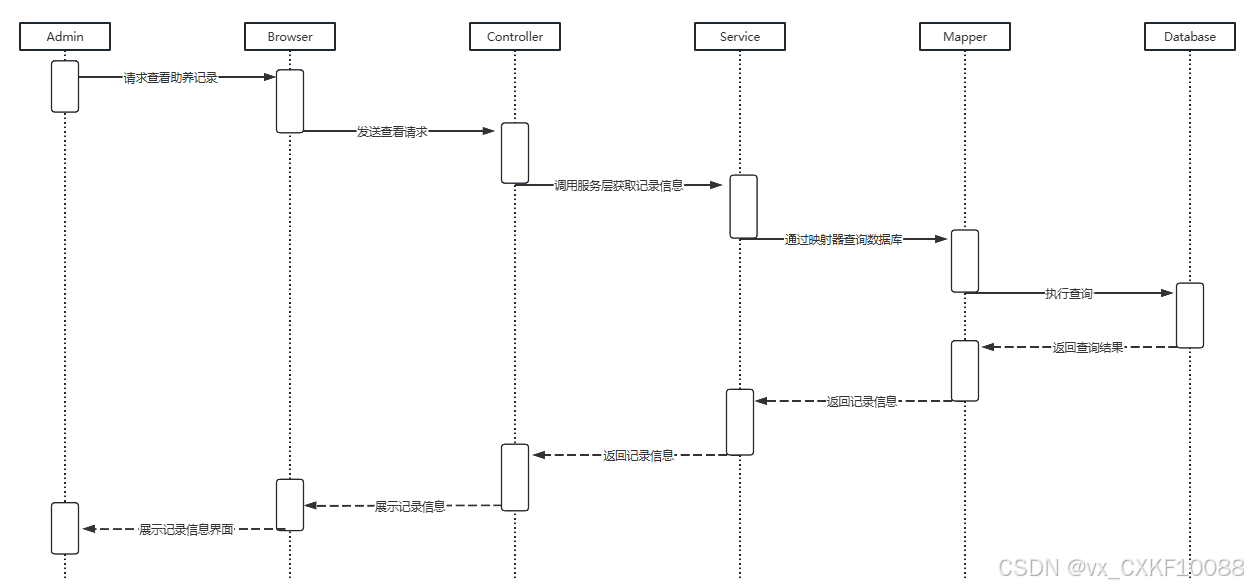 管理员请求查看助养记录。浏览器发送请求至控制器。控制器调用服务层获取记录信息。服务层通过映射器查询数据库。结果返回控制器,展示在浏览器。时序图如图5-22所示。
