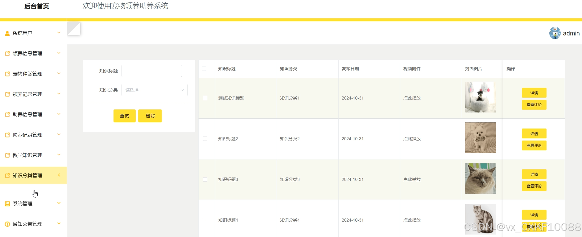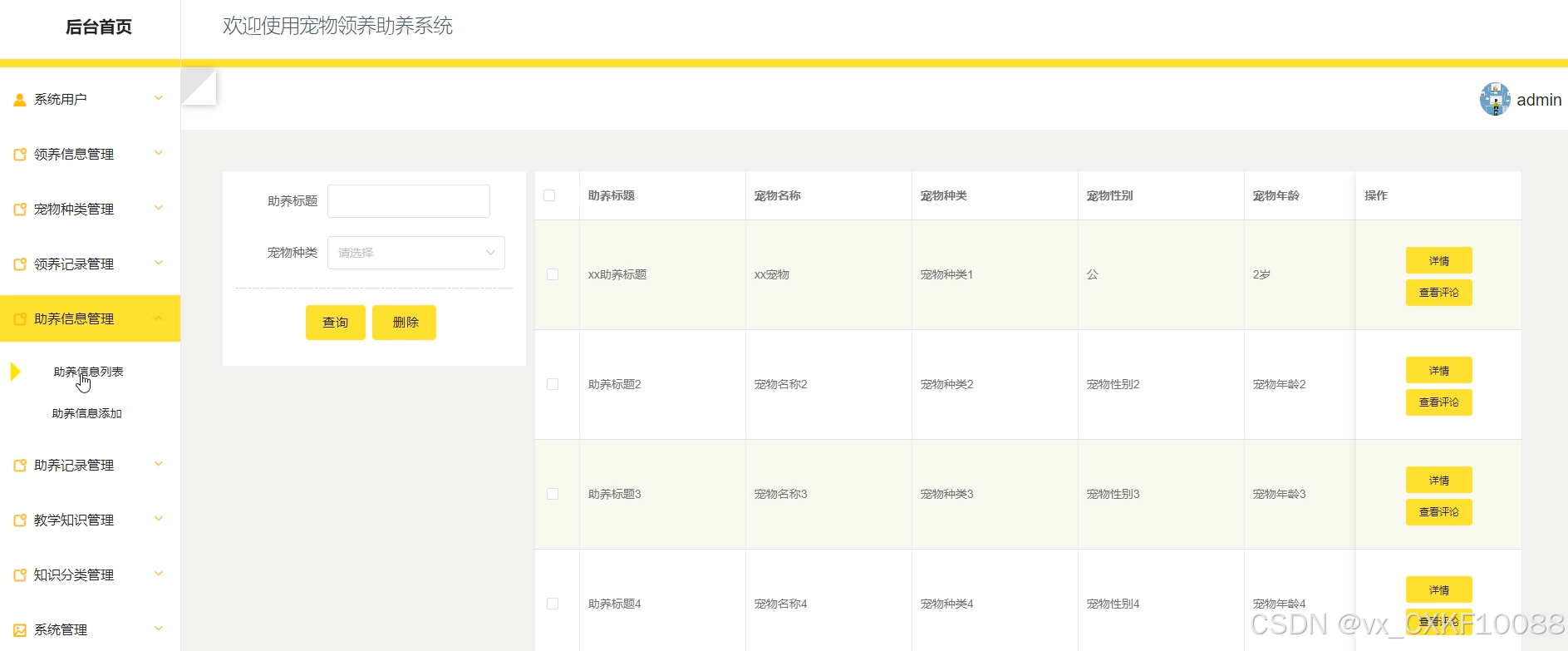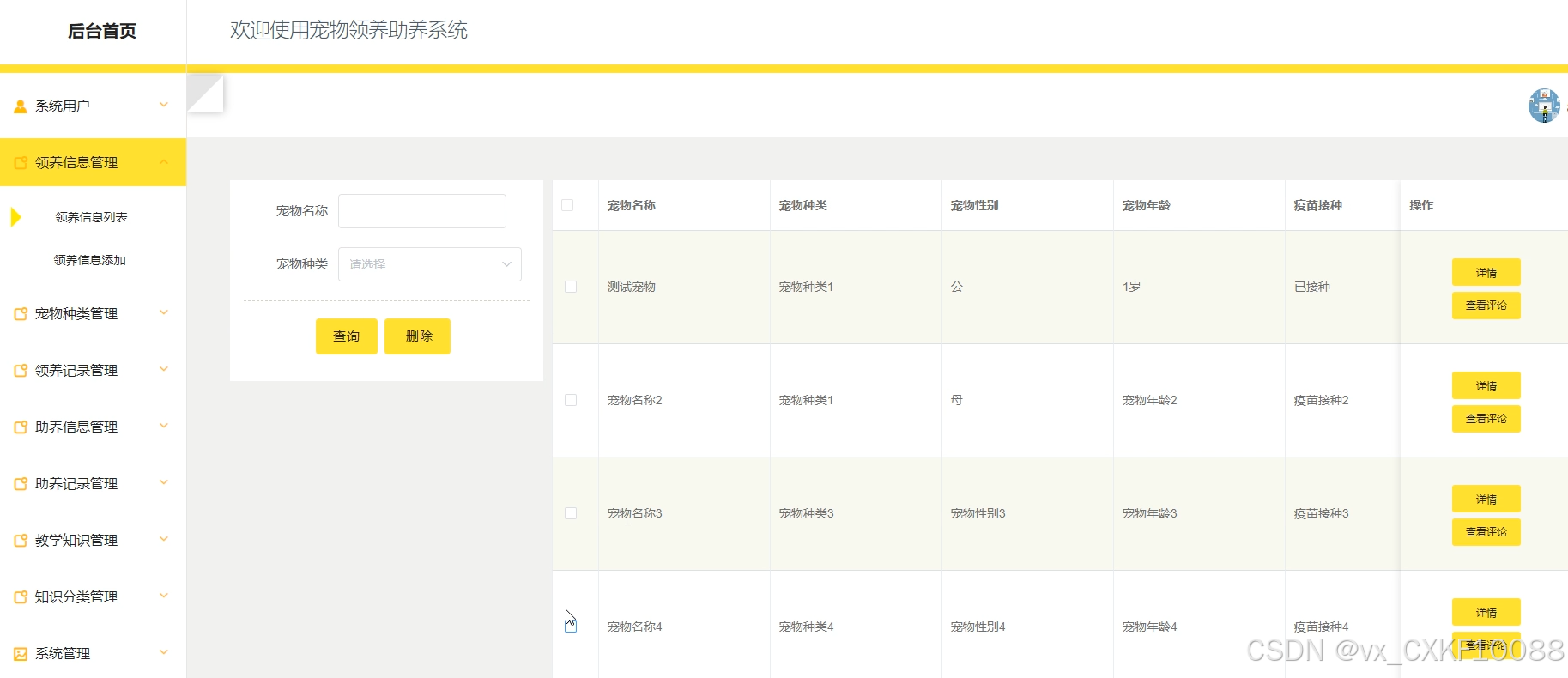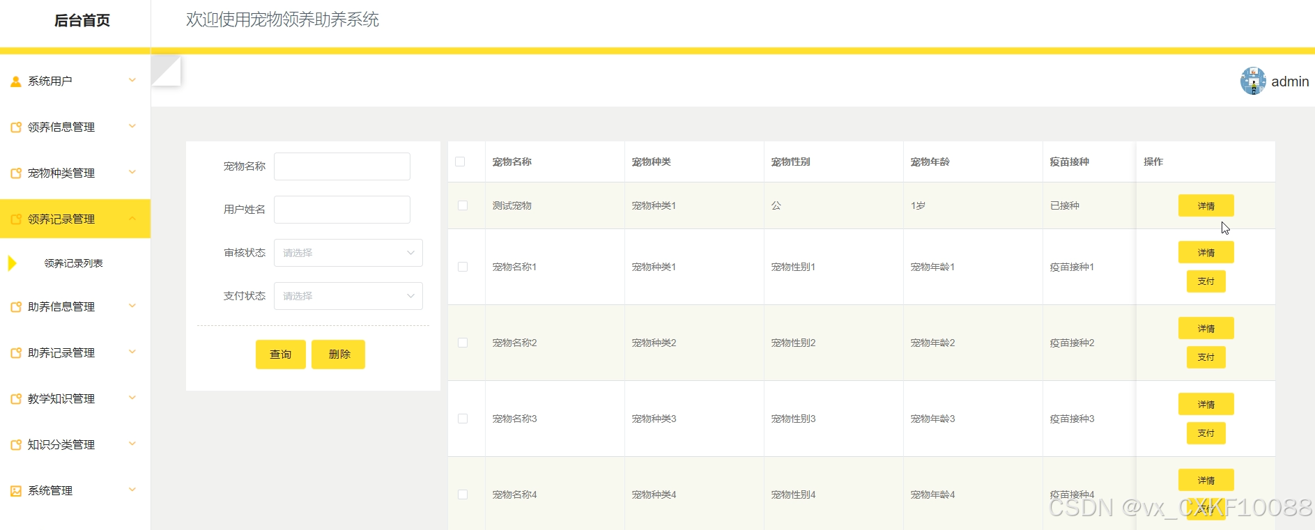 经过系统的调试与测试,该宠物领养助养系统能够实现用户的注册、登录、宠物信息浏览、领养申请及助养教学;管理员的用户管理、宠物领养审核、助养管理等功能,基本满足宠物领养助养管理全流程。通过对使用者的调查及系统评估,该系统能够有效地解决传统宠物领养方式中存在的问题,简化领养流程,帮助用户快速了解养护宠物的知识,提高了领养的便捷性与透明度,为用户和管理员提供了良好的使用体验。