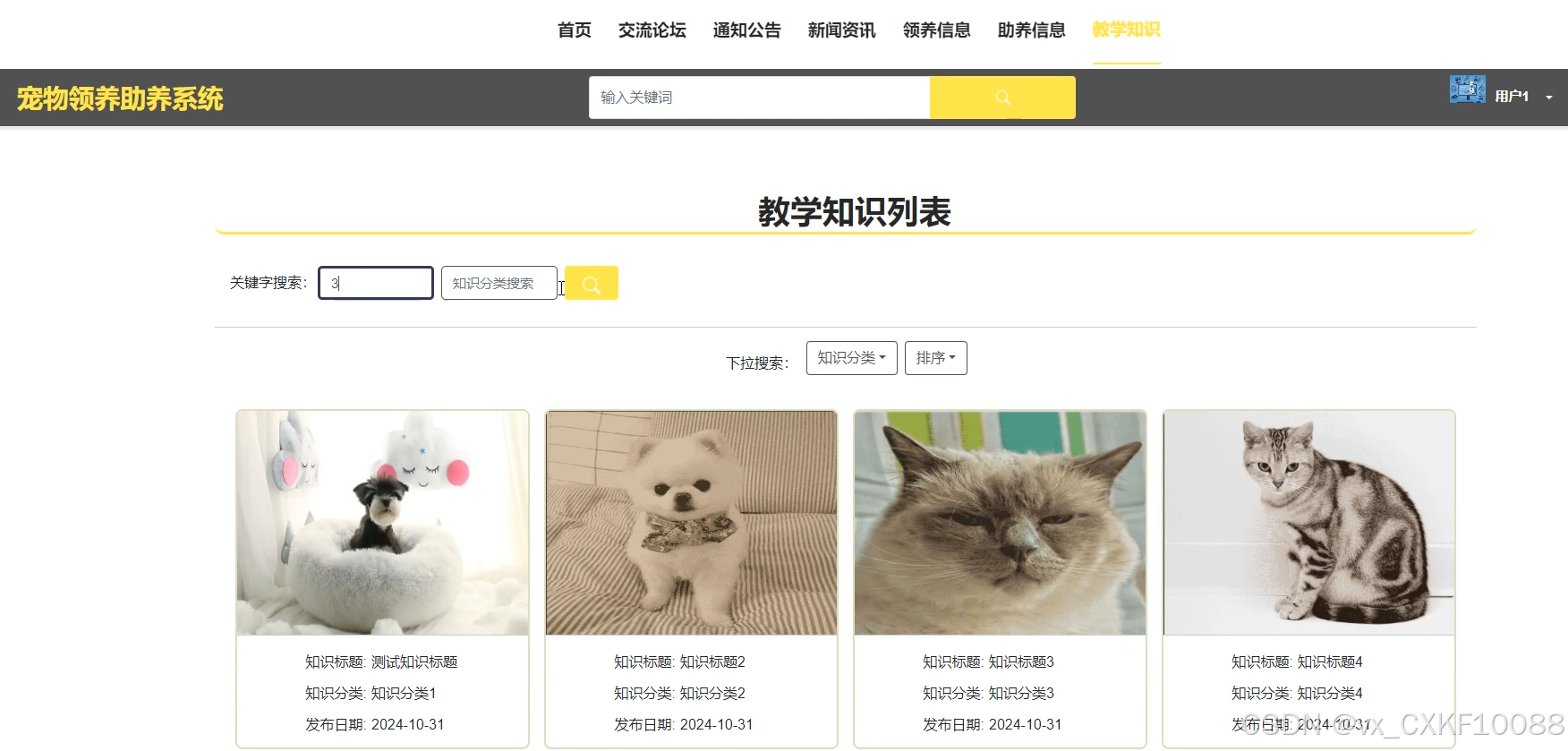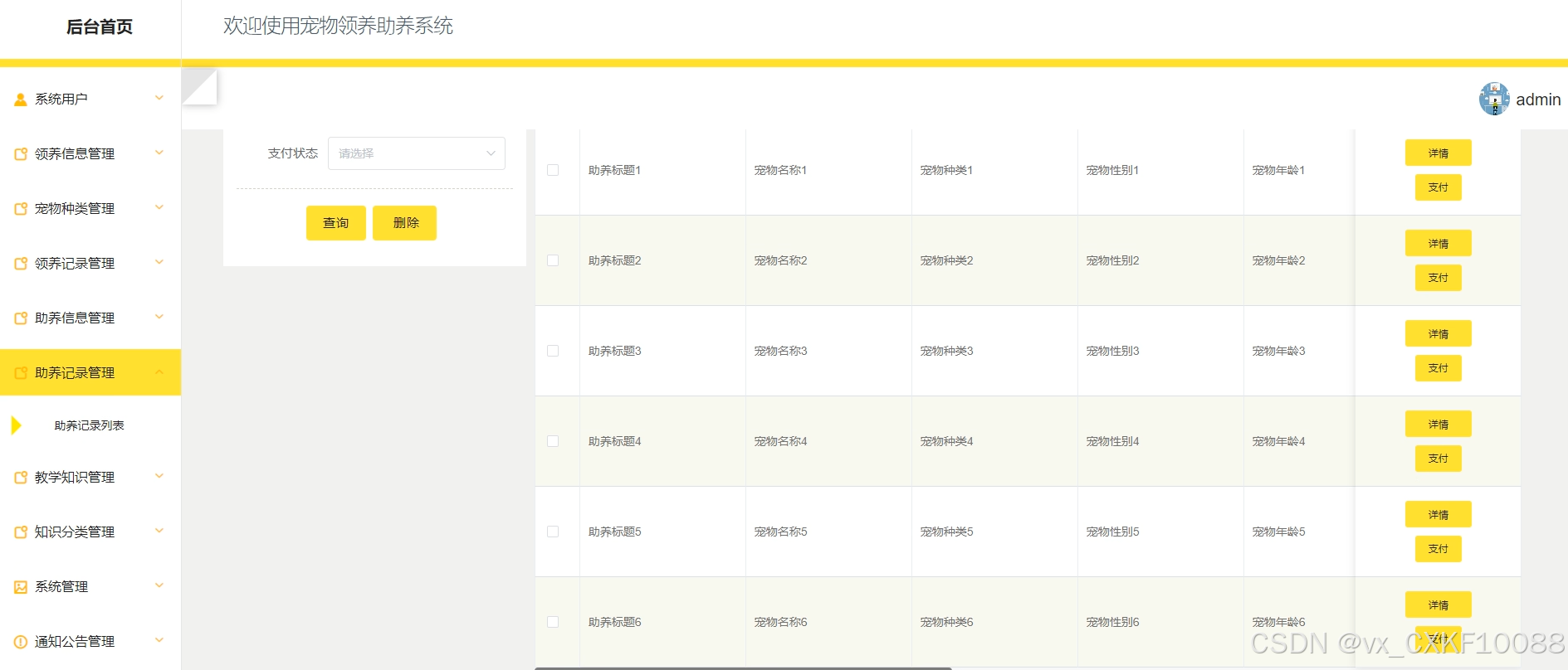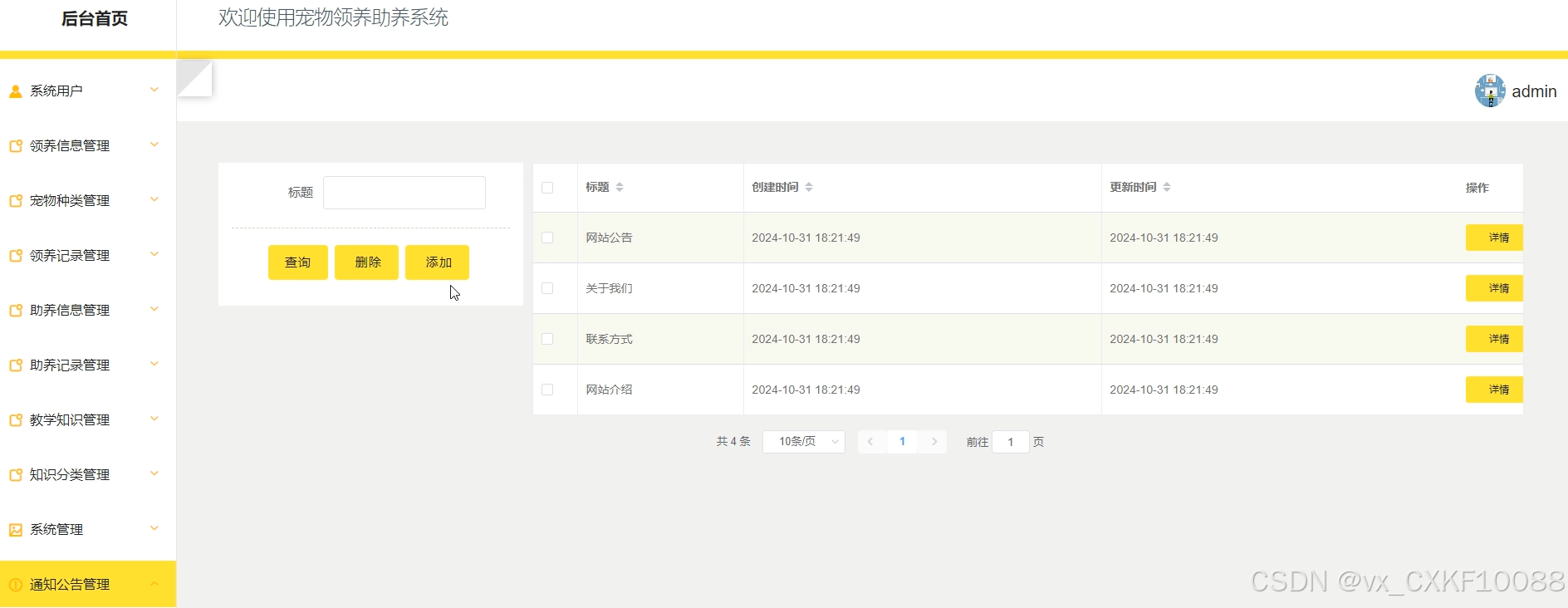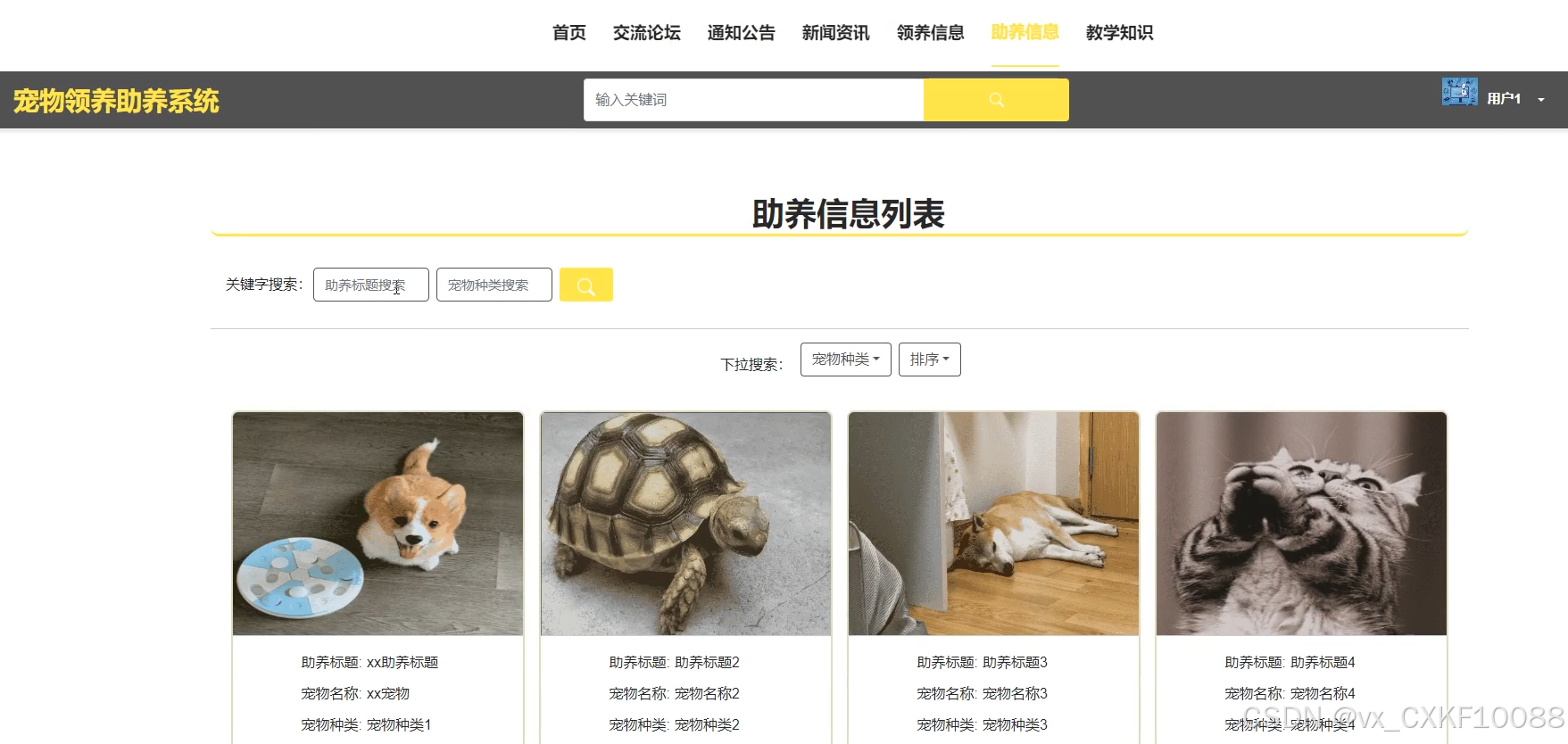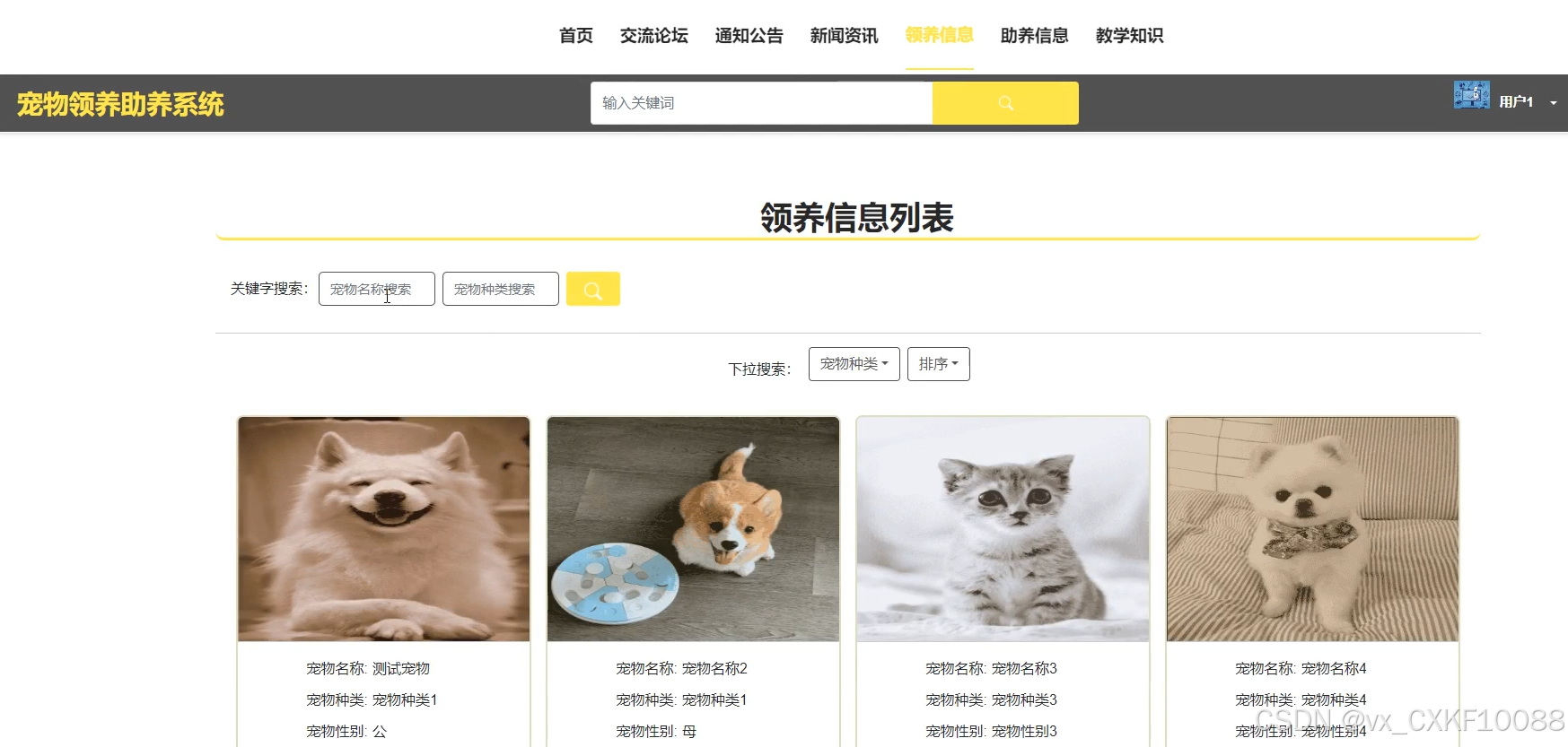 经过系统的调试与测试,该宠物领养助养系统能够实现用户的注册、登录、宠物信息浏览、领养申请及助养教学;管理员的用户管理、宠物领养审核、助养管理等功能,基本满足宠物领养助养管理全流程。通过对使用者的调查及系统评估,该系统能够有效地解决传统宠物领养方式中存在的问题,简化领养流程,帮助用户快速了解养护宠物的知识,提高了领养的便捷性与透明度,为用户和管理员提供了良好的使用体验。