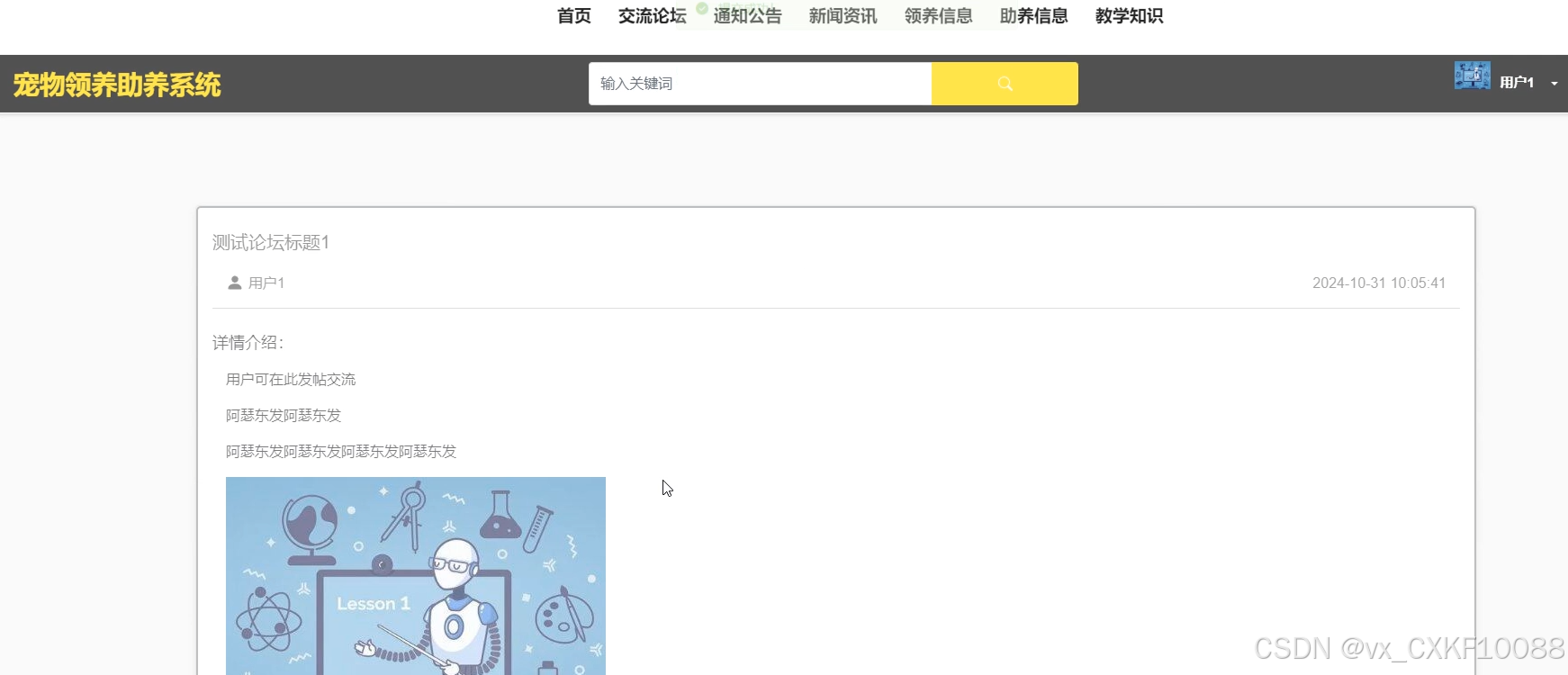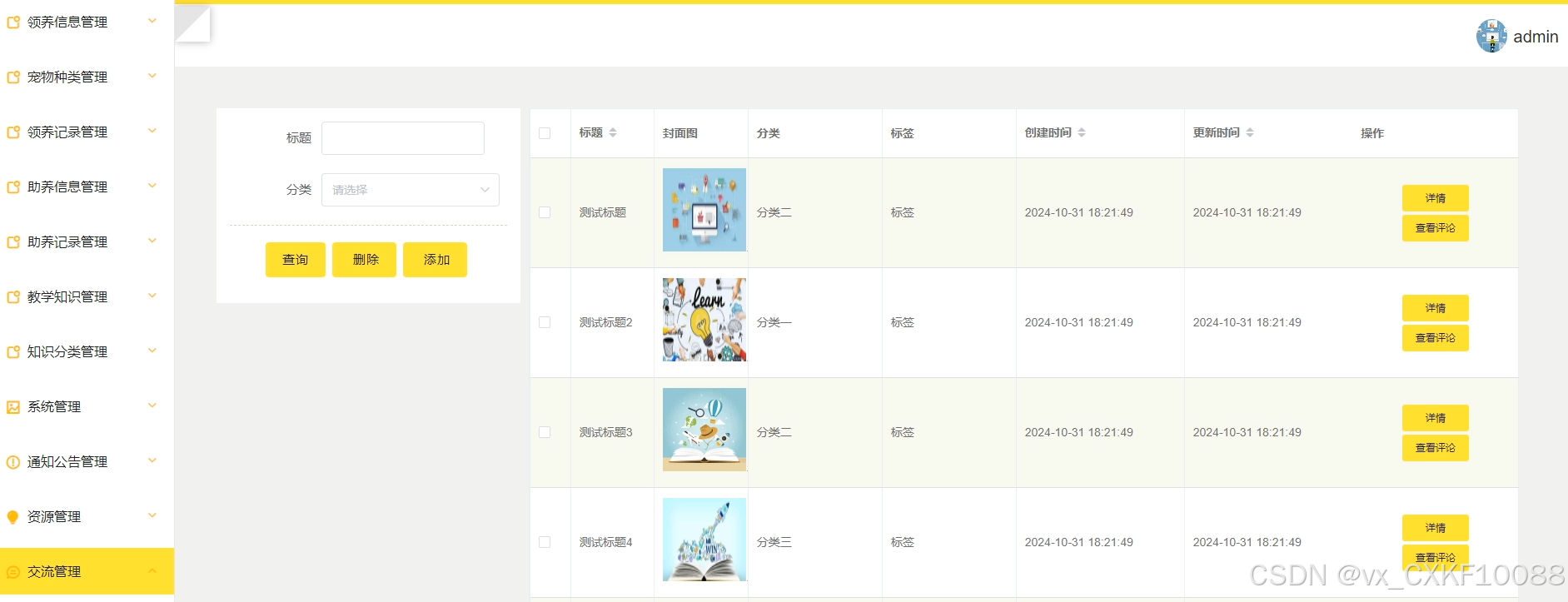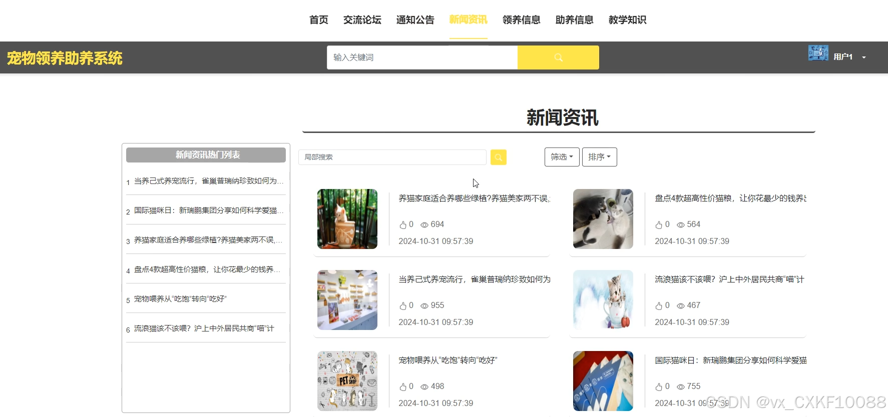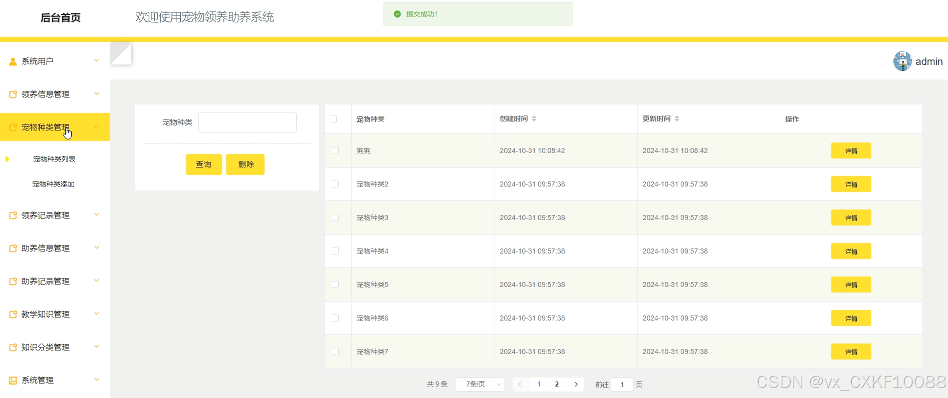 经过系统的调试与测试,该宠物领养助养系统能够实现用户的注册、登录、宠物信息浏览、领养申请及助养教学;管理员的用户管理、宠物领养审核、助养管理等功能,基本满足宠物领养助养管理全流程。通过对使用者的调查及系统评估,该系统能够有效地解决传统宠物领养方式中存在的问题,简化领养流程,帮助用户快速了解养护宠物的知识,提高了领养的便捷性与透明度,为用户和管理员提供了良好的使用体验。