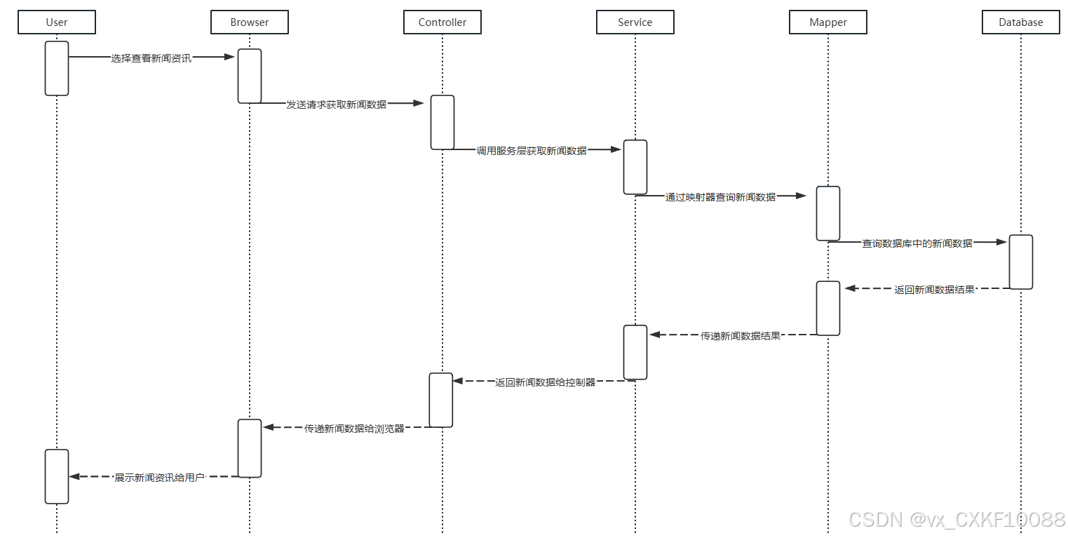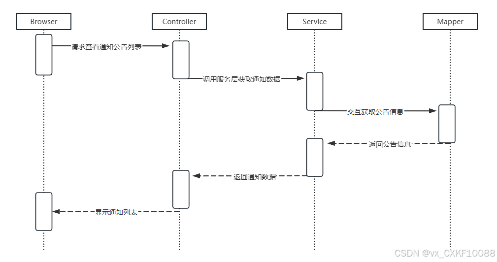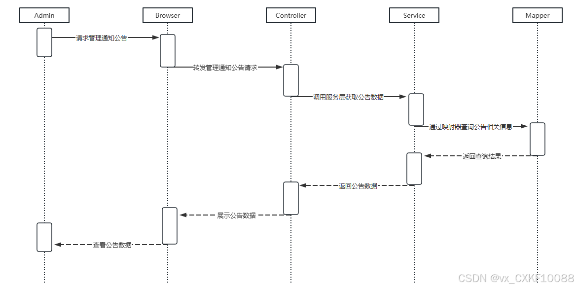 管理员请求管理通知公告。浏览器将请求转发至控制器。控制器调用服务层获取公告数据。服务层通过映射器查询相关信息。结果返回控制器,展示在浏览器。通知公告管理时序图如图5-25所示。