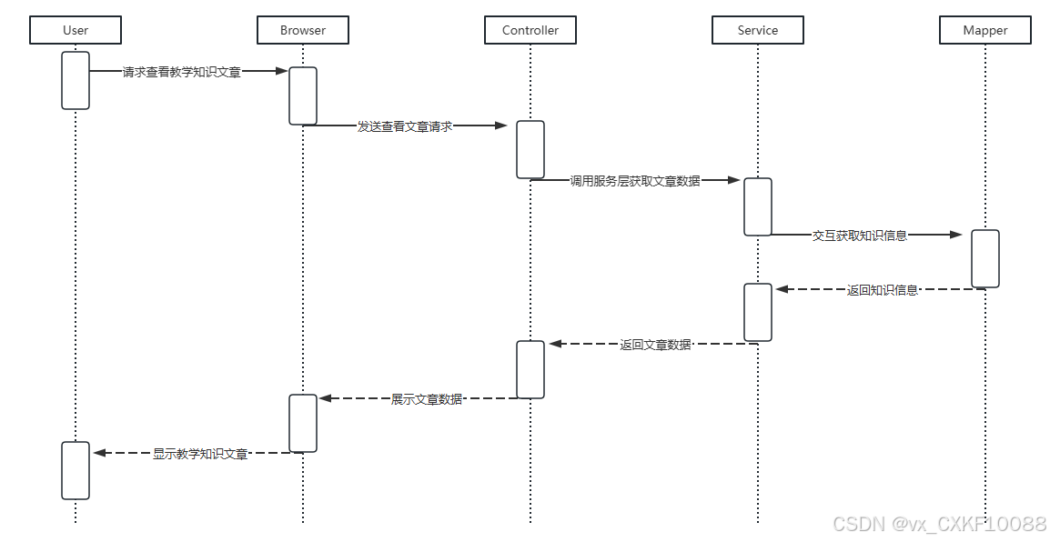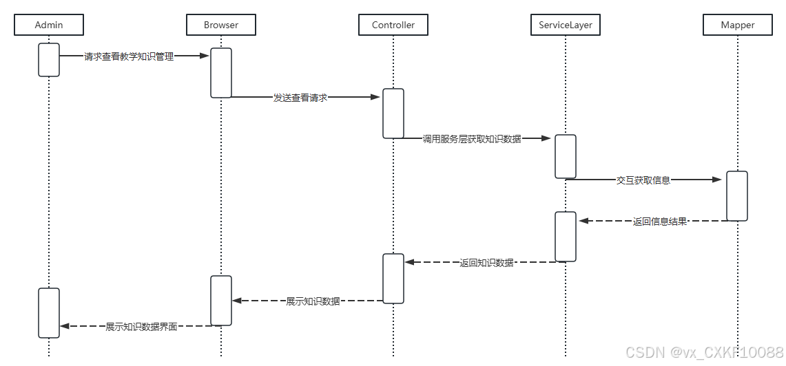 管理员请求查看教学知识管理。浏览器将请求发送至控制器。控制器调用服务层获取知识数据。服务层与映射器交互获取信息。结果返回控制器,展示在浏览器。教学知识管理功能时序图如图5-23所示。