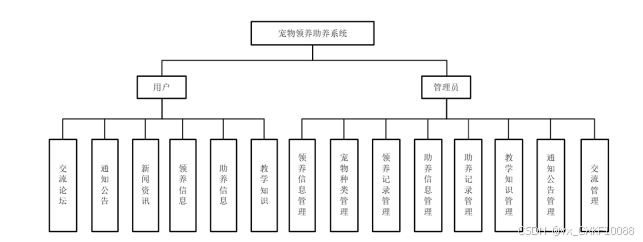 本宠物领养助养系统设计分为两个主要用户角色:普通用户和管理员。以下是对每个角色的功能需求的详细描述。