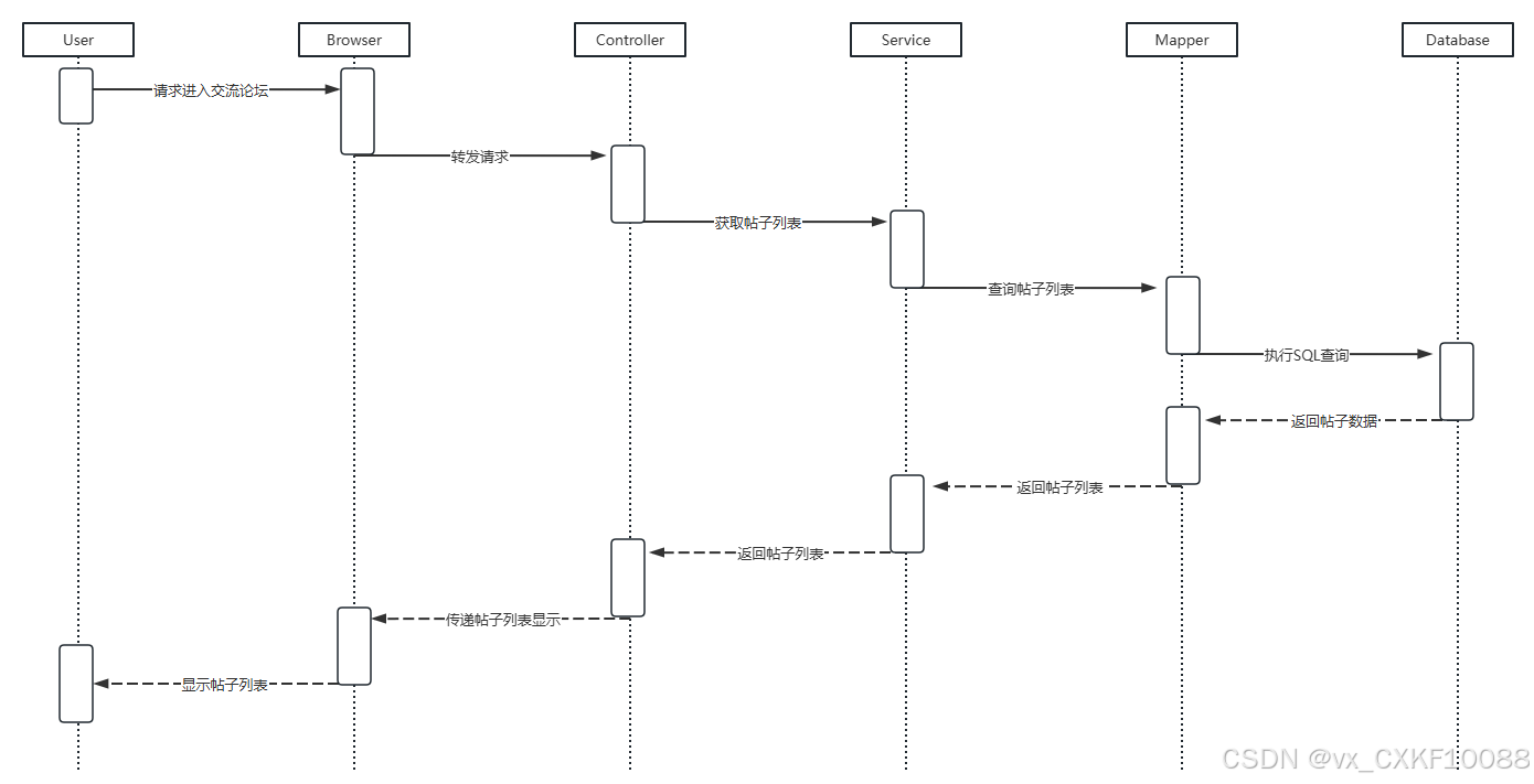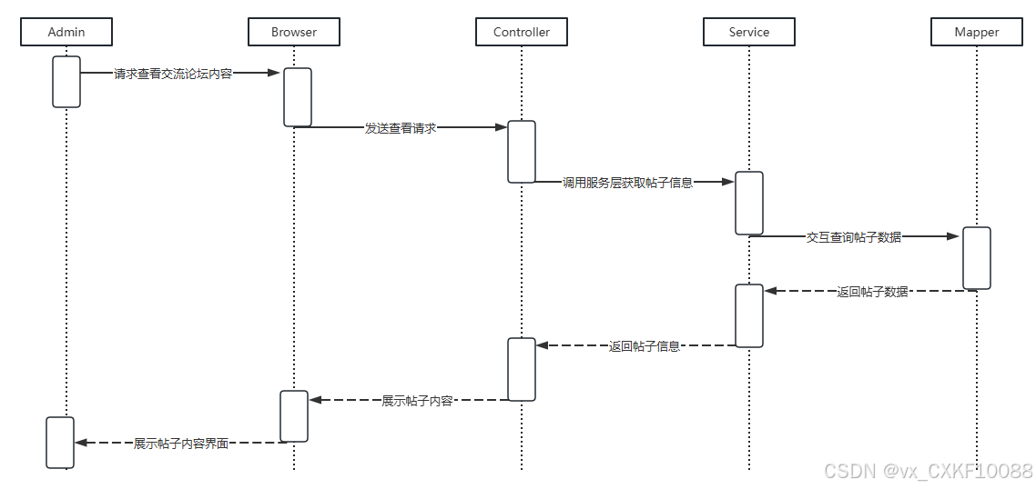 管理员请求查看交流论坛内容。浏览器发送请求至控制器。控制器调用服务层获取帖子信息。服务层与映射器交互查询数据。结果返回控制器,展示在浏览器。交流管理功能时序图如图5-27所示。