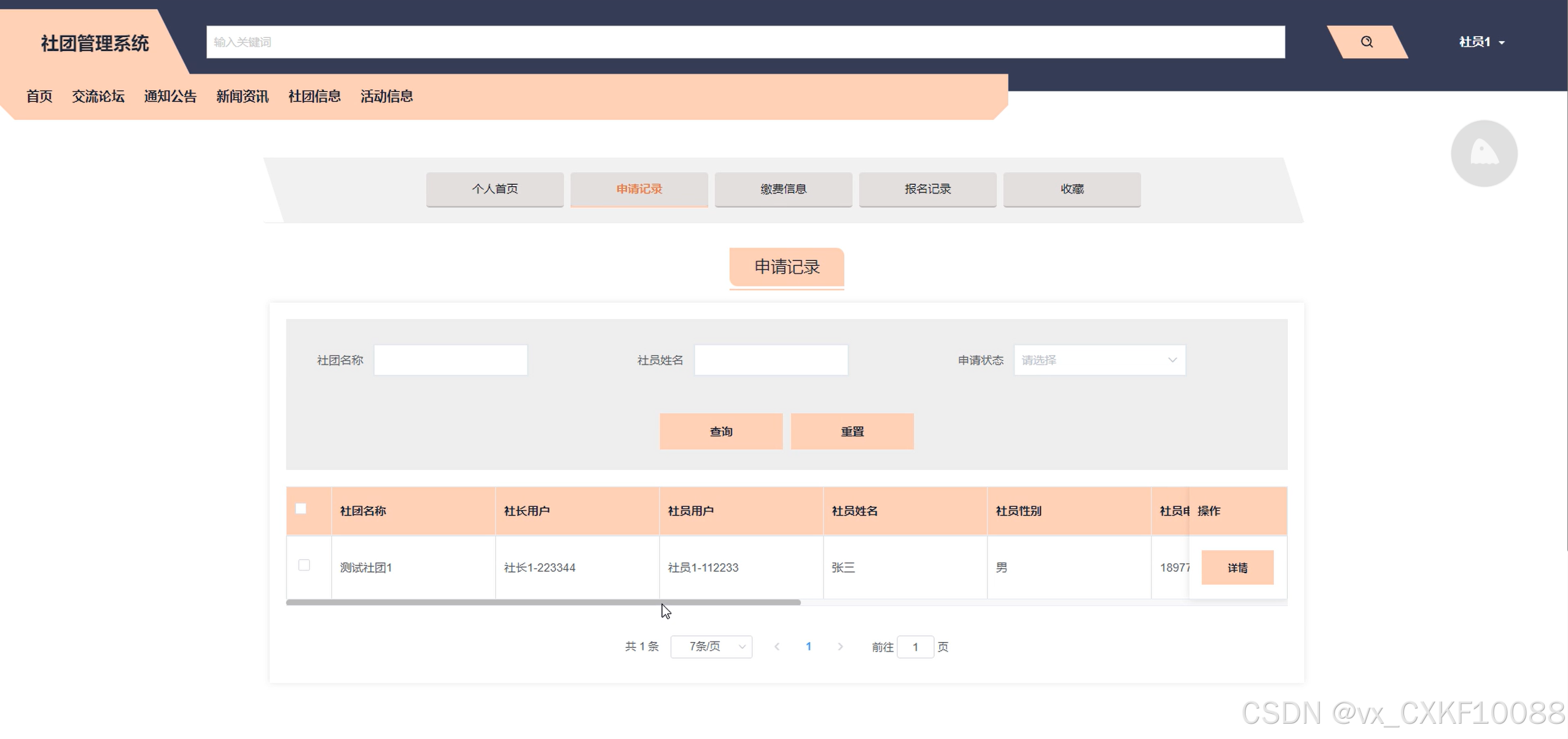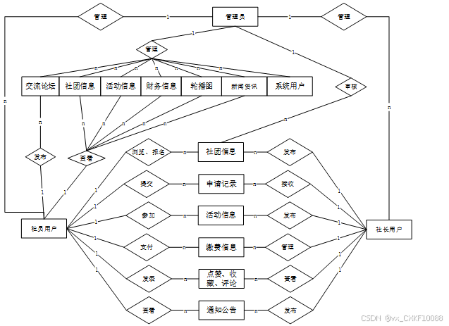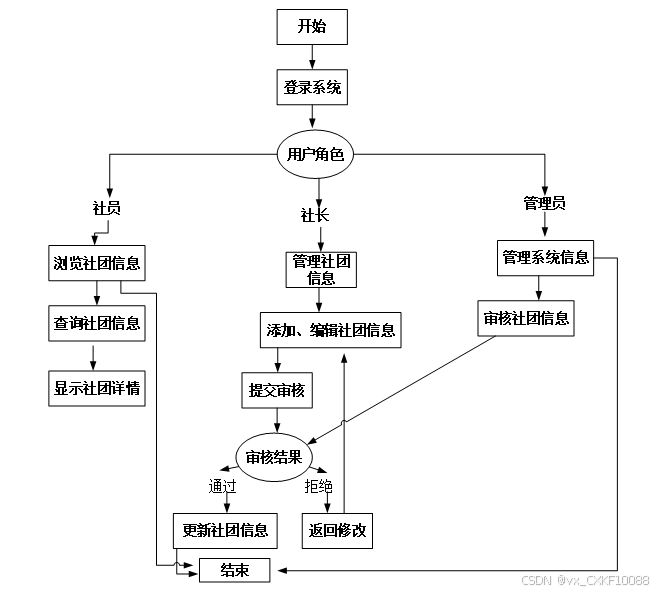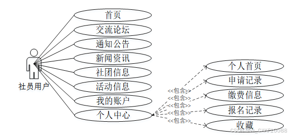 - 社员用户:能够浏览社团新闻、活动信息,参与论坛讨论,查看社团资料,管理个人账户,包括申请记录、缴费信息、报名参与活动和个人收藏。