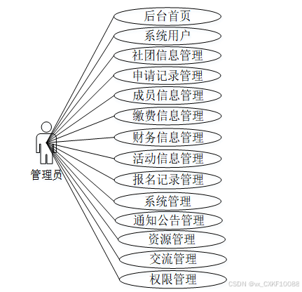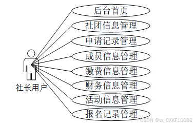通过对应的功能做了需求分析以后该社团管理系统各角色主要包括的功能说明如下:
