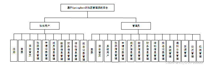 社团管理系统的后台功能设计全面而强大,专为社长和管理员打造。通过后台首页,他们可以高效管理社团信息、成员信息、缴费记录及财务信息,确保社团运营的透明与规范。此外,系统支持活动信息的发布与管理,以及报名记录的跟踪,便于组织社团活动。管理员还享有系统管理权限,包括用户管理、轮播图更新、通知公告发布、资源及交流论坛的管理等,全面提升社团管理的灵活性和效率。权限分配机制确保不同角色间数据的安全隔离与协同工作。系统后台功能模块图如下图所示。