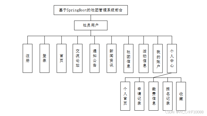 基于SpringBoot的社团管理系统前台功能丰富,为社员用户提供了一站式的社团参与体验。社员可轻松访问首页获取社团最新动态,参与交流论坛与成员互动,浏览通知公告与新闻资讯以掌握社团信息。同时,系统提供详尽的社团信息展示和活动报名服务,方便社员了解并参与社团活动。在个人中心,社员能管理个人账户信息,查看申请、缴费、报名记录及收藏内容,实现个性化信息管理。整体设计注重用户体验,提升社团管理的效率和成员满意度。系统前台功能模块图如下图所示。