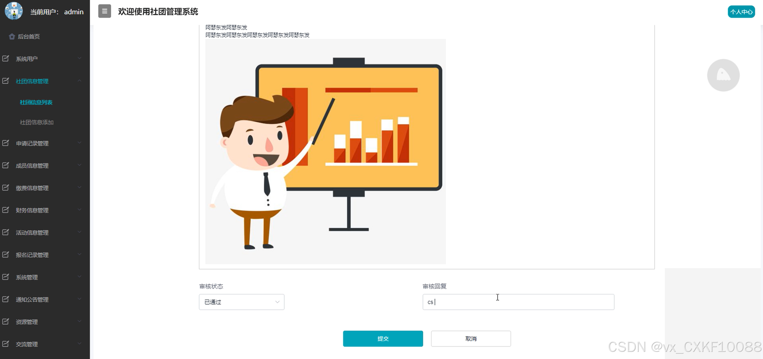 社团管理系统的主要研究内容,依托SpringBoot框架的强大能力,致力于构建一个集全面性、高效性与用户友好性于一体的社团管理平台。该平台精准对接社员用户、社长用户及管理员的多元化需求,通过Vue.js的响应式与组件化开发技术,实现了界面的流畅交互与数据的高效处理。社团管理系统深入探索社团信息、成员管理、财务记录、活动组织、通知公告、新闻资讯、交流论坛及系统管理等多个关键领域,实现了社团日常运营的全面数字化与智能化转型。此外,社团管理系统还强化了数据的稳定存储与高效访问,依托MySQL数据库保障数据安全。通过这一系列功能模块的整合与优化,不仅促进了社团内部的紧密沟通与高效协作,还显著提升了社团管理的效率与水平,为社团的持续发展注入了新的活力与动能。