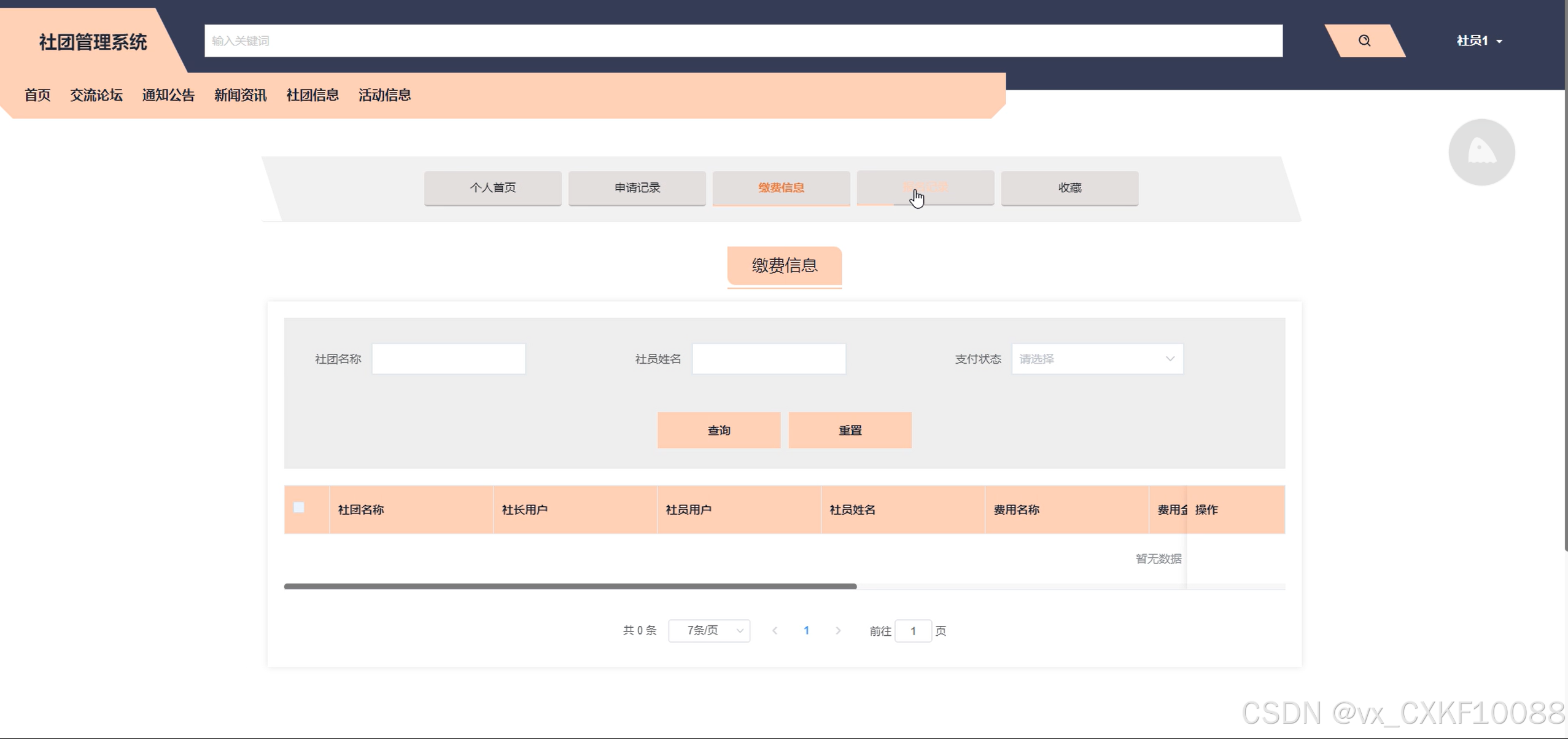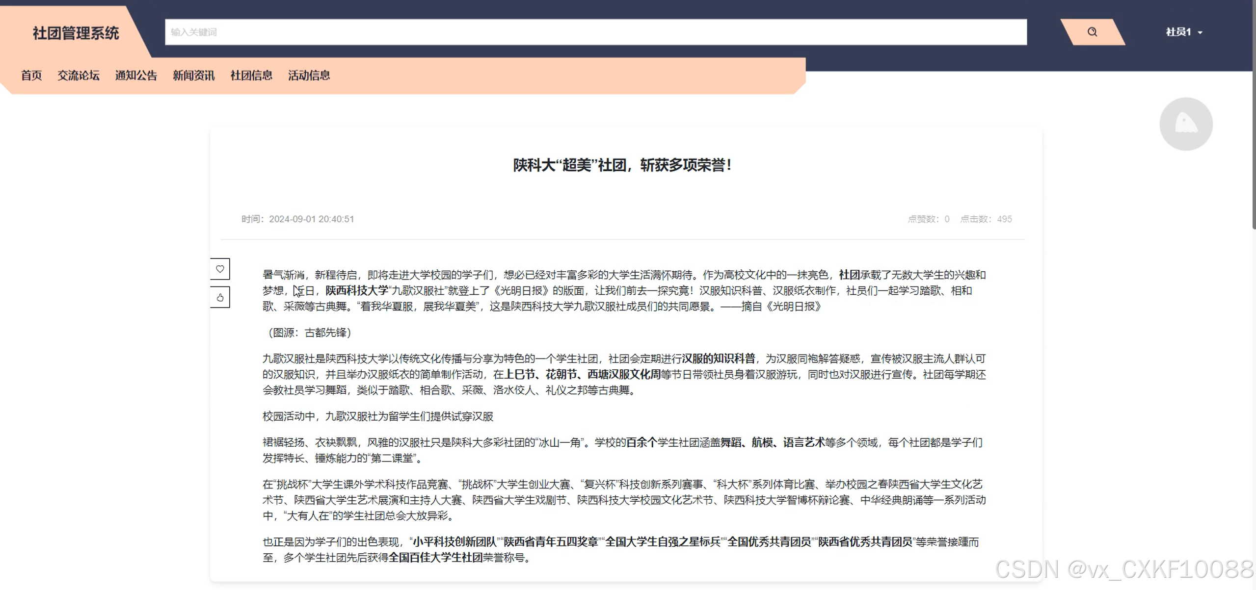 This article uses advanced Java programming language and the powerful SpringBoot framework to build an efficient and scalable community management platform. The backend of the platform adopts MySQL database as the data storage solution, ensuring the stability, security, and efficient access of data. This system covers a wide range of front-end and back-end functions. The front desk mainly serves member users, providing an intuitive and easy-to-use interface that allows members to easily browse club information, participate in activity registration, view notifications and news, and manage their accounts, application records, payment information, registration records, and favorite content in the personal center. The backend part is aimed at the president and administrators, providing comprehensive club management functions, including club information management, member information management, activity arrangement and registration record tracking, financial management, etc. At the same time, it also supports system management such as user permission allocation, notification and announcement publishing, resource uploading and downloading, communication forum management, etc., ensuring the standardization and efficiency of club management. Through the club management system, club managers can significantly improve work efficiency, reduce labor costs, and members can also enjoy more convenient and personalized service experiences. The flexibility and scalability of the system also provide a solid foundation for the iterative upgrading of future functions.