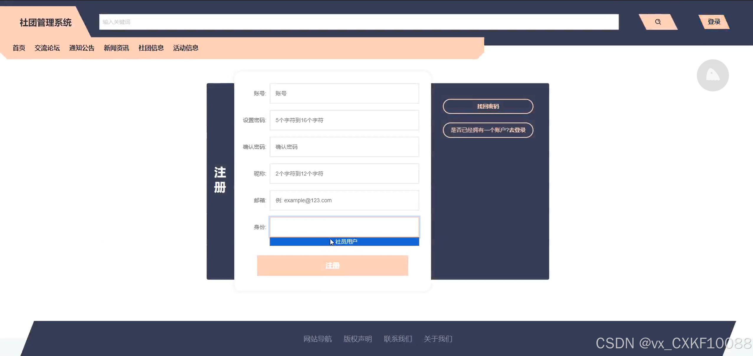 - 成员信息管理:让社长和管理员能够查看和管理社团成员资料,跟踪成员参与度,维护成员活跃度和忠诚度。身份验证功能:这个模块包括了用户的注册、登录、修改密码、找回密码等功能。这些功能可以保证用户的身份和权限的正确性和安全性。