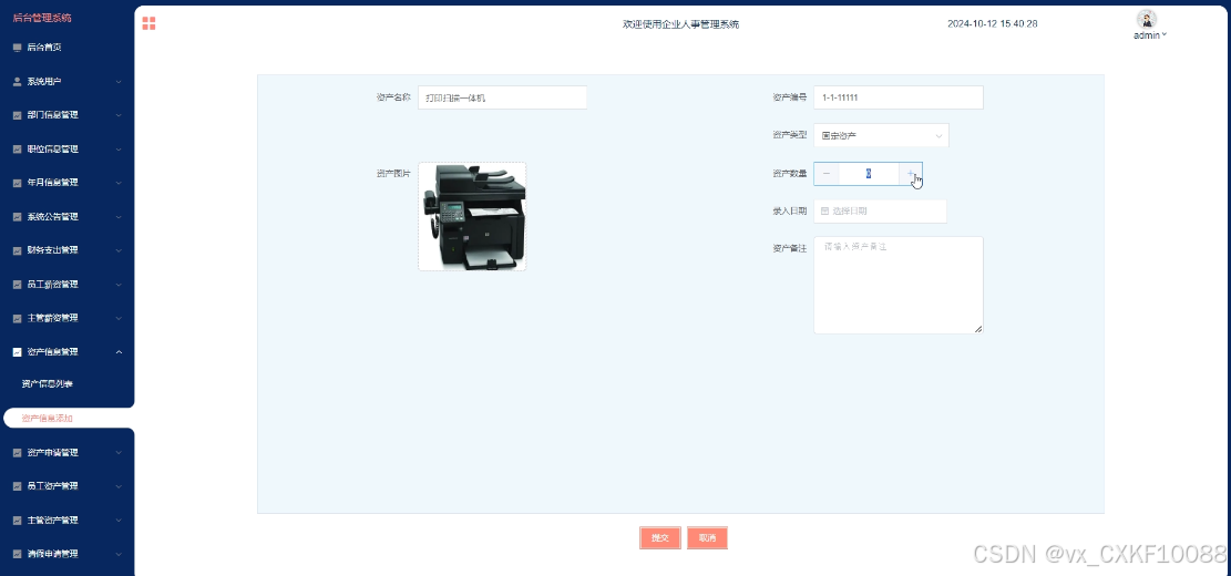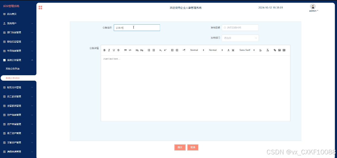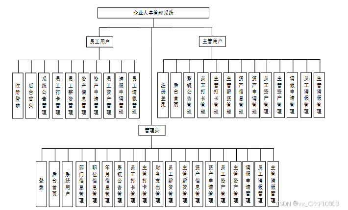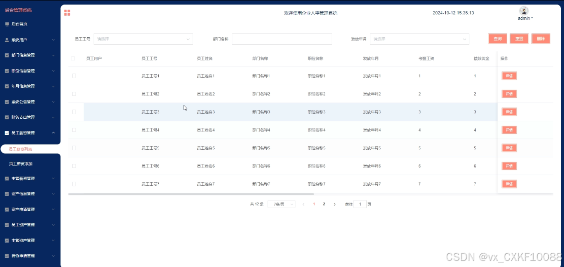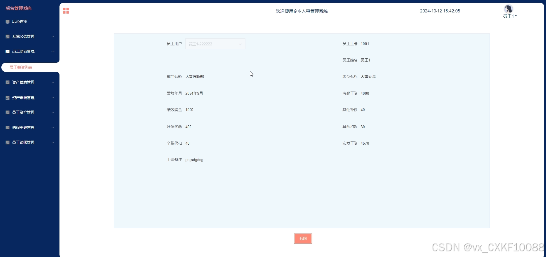 This article analyzes the needs of enterprise personnel management and designs and implements a fully functional, easy-to-use, and user-friendly enterprise personnel management system. It has multiple functions such as registration, login, backend homepage, system users, department information management, position information management, year and month information management, system announcement management, employee check-in management, supervisor check-in management, financial expenditure management, employee salary management, supervisor salary management, asset information management, asset application management, employee asset management, supervisor asset management, leave application management, employee leave management, and supervisor leave management.