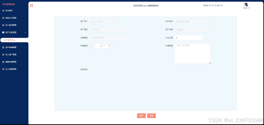 - 资产申请管理:员工用户可管理自己的资产申请信息,包括查询、删除、编辑资产申请,确认申请审核状态。
