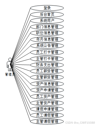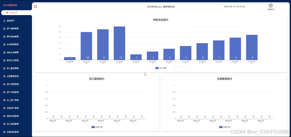 - 后台首页:管理员登录系统后首先进入后台首页界面,该界面主要提供西重要信息概览和数据分析统计图表(包括财务支出、员工薪资、主管薪资等图表)。