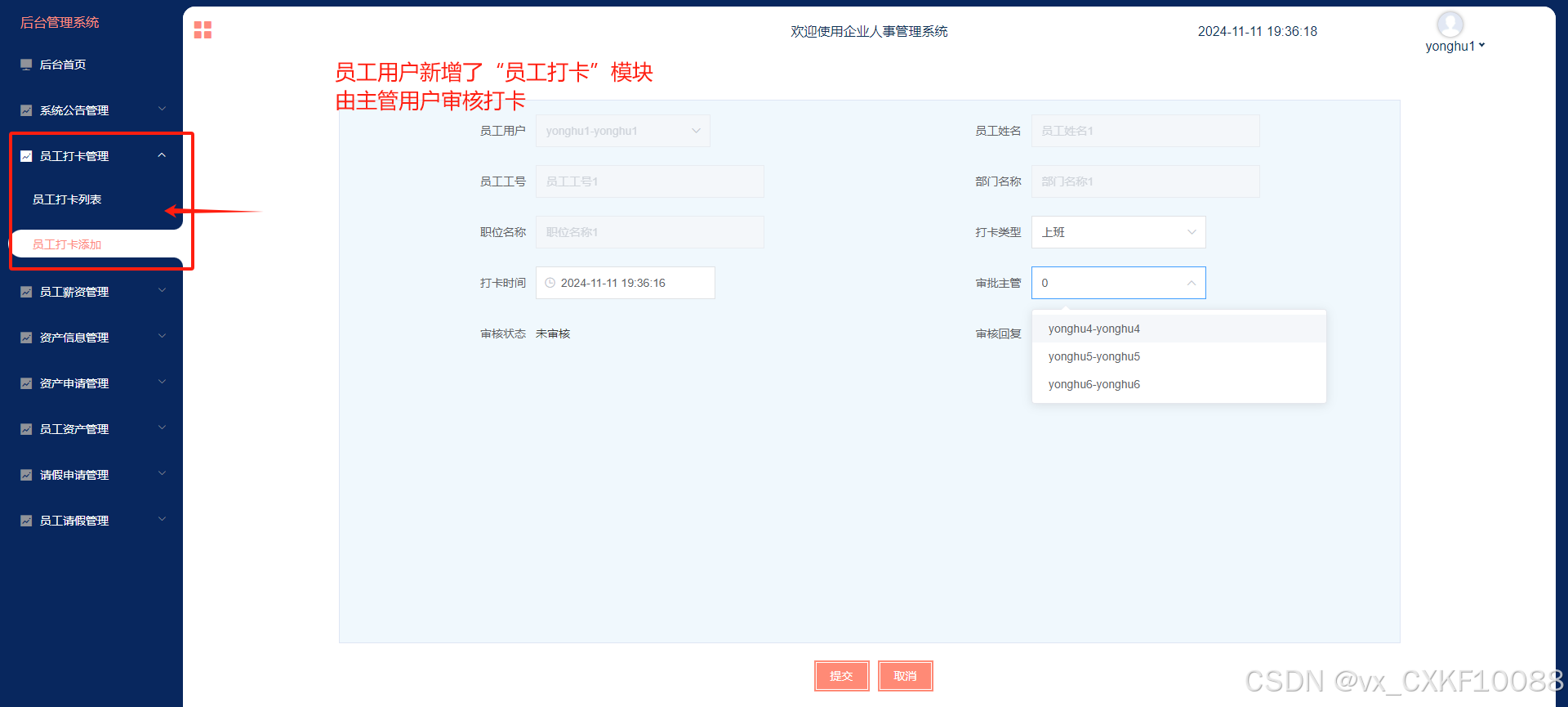 - 系统用户:管理员可管理系统的所有系统用户信息,包括员工用户、主管用户、管理员账号等,支持用户权限管理和角色设置,可增改删查和审核系统用户信息。