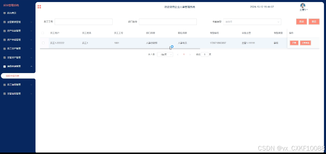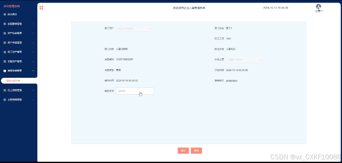 - 请假申请管理:员工用户可管理自己的请假申请信息,包括添加、查询、删除、编辑请假申请。