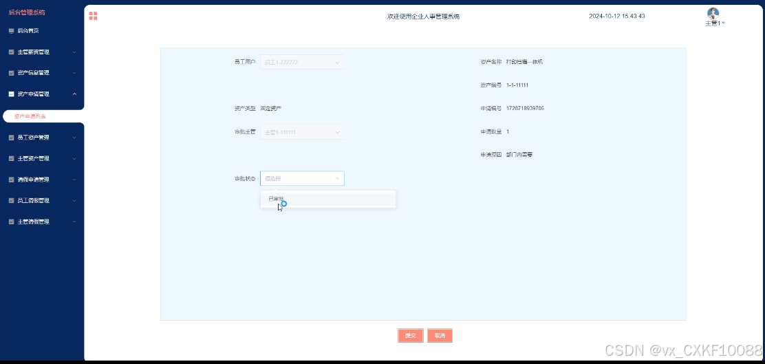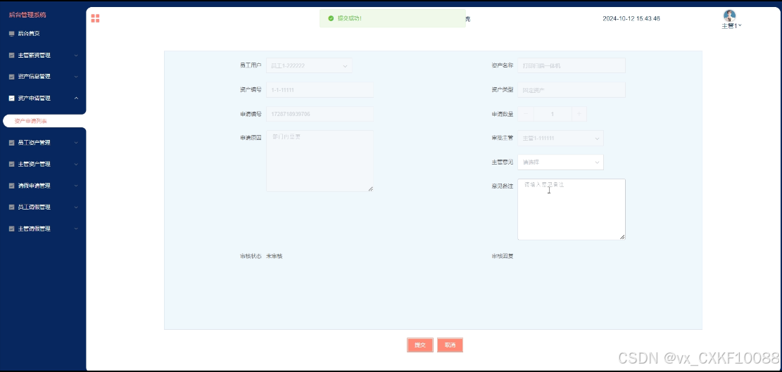 - 资产申请管理:主管用户可管理搜索和浏览自己的资产申请信息,可进入详情页审核员工的资产申请信息;并提供主管审批操作,填写主管意见及备注。