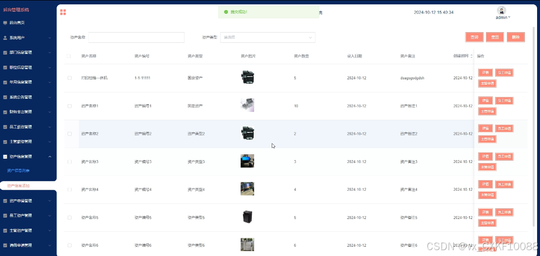- 资产信息管理:员工用户可搜索和浏览所有资产信息,并提供员工申请操作。