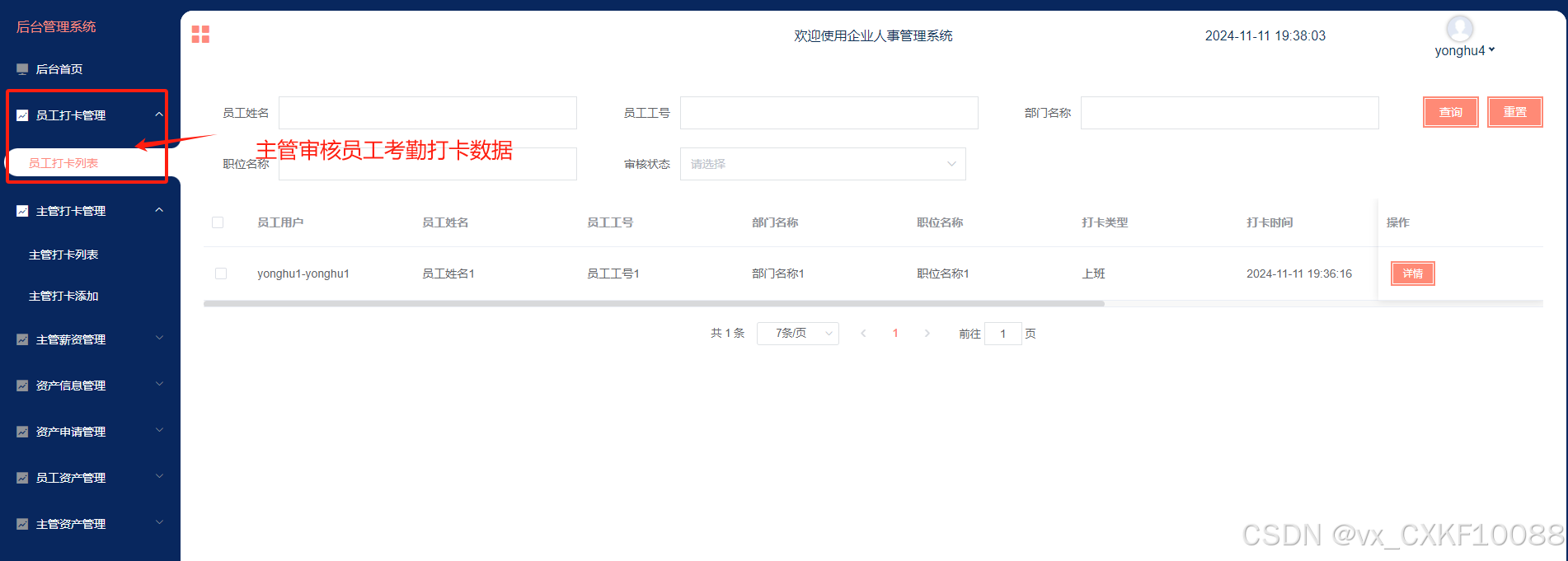 - 员工打卡管理:管理员可管理所有员工打卡信息,包括添加、查询、删除、编辑员工打卡,支持审核员工打卡信息。