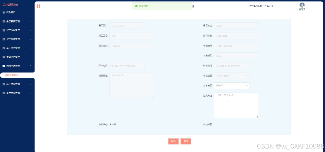 - 请假申请管理:主管用户可管理所有请假申请信息,包括查询、删除、编辑请假申请,可进入详情页审核员工的请假申请信息;并提供主管审批操作,填写主管意见及备注。