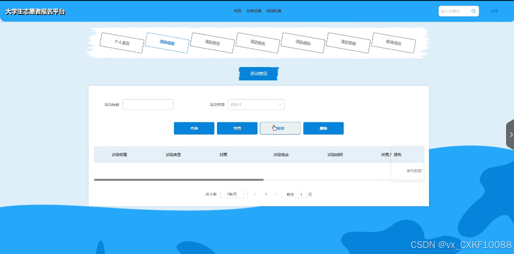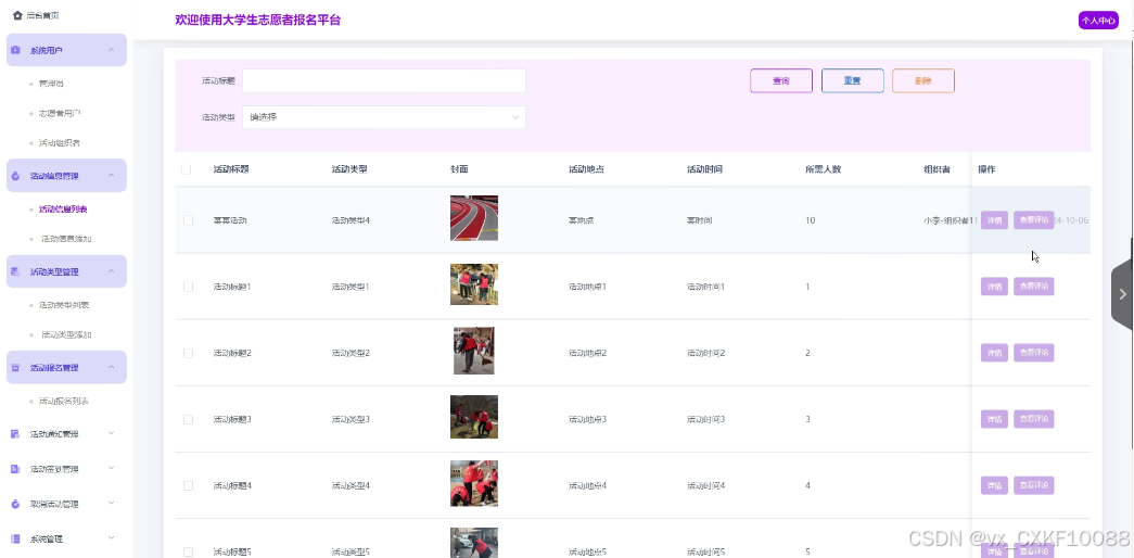 活动信息管理:管理员点击可查看活动信息列表和活动信息添加,同时可对活动信息进行增删改查。界面如下图所示。