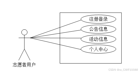 通过构建用例图,来更好的展示出志愿者用户这个角色所有的功能,如下。