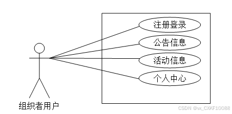 通过构建用例图,来更好的展示出活动组织者用户这个角色所有的功能,如下。