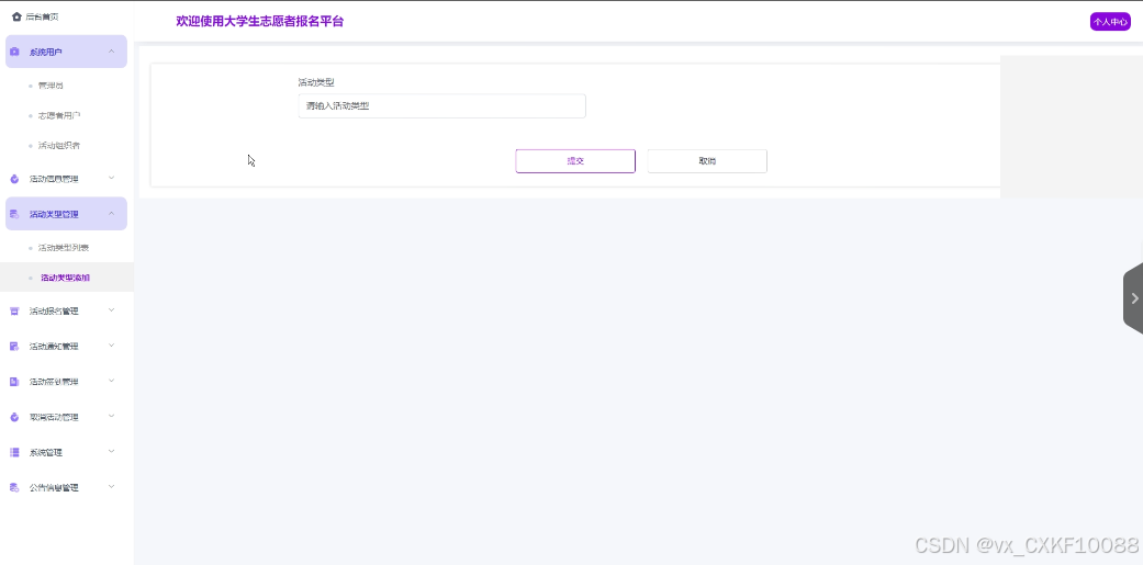活动类型管理:管理员点击可查看活动类型列表和活动类型添加,同时可对活动类型进行增删改查。界面如下图所示。