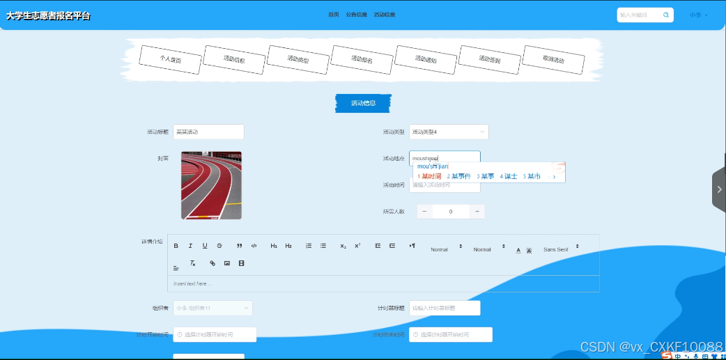 活动信息:活动组织者可输入活动标题、活动类型、活动地点、所需人数、封面等信息发布信息。展示如下图所示。