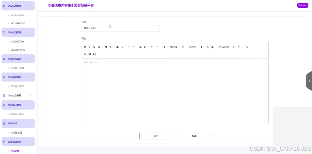 本文介绍了一个基于Spring Boot的大学生志愿者报名平台。随着大学生创新创业项目管理教育的推广和发展,越来越多的高校需要一个全面、高效的管理系统来支持和促进学生创新创业活动的开展。