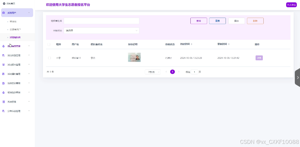 系统用户:当管理员点击“系统用户”时,可管理管理员、志愿者用户和活动组织者用户;如需添加新的活动组织者用户,点击右侧“添加”按钮,上传头像,输入账号、密码、昵称、邮箱、,选择状态和性别,点击“提交”按钮进行添加;同时可对系统用户进行增删改查。界面如下图所示。