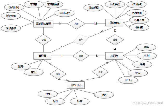 在数据库概念模型设计的时候,一般都采用E-R实体图进行展示,在实体图中可以展示出数据库表中的所有字段名称,本大学生志愿者报名平台中的主要的数据库E-R模型图如下图所示。