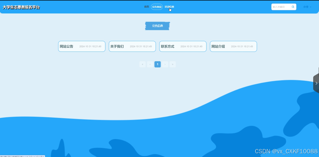 公告信息:活动组织者和志愿者用户可以查看网站公告、关于我们、联系方式、网站介绍等信息。