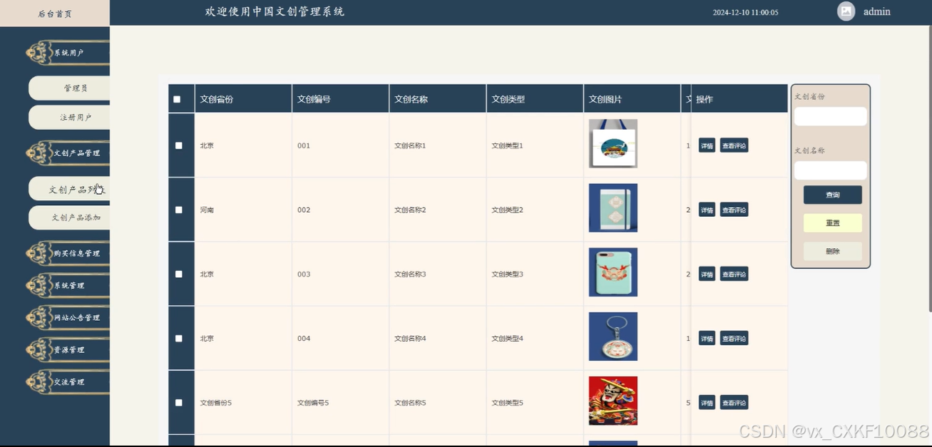 用户可以查看和购买文创产品,在文创产品模块中,产品按照不同的类别和属性进行了详细分类。用户可以输入关键字(如文创名称或省份)进行搜索,找到自己喜欢的产品。每个产品页面包含详细的产品信息,如名称、价格、类型、库存等,用户可以通过这些信息了解产品详情,并进行购买操作。如下图所示。