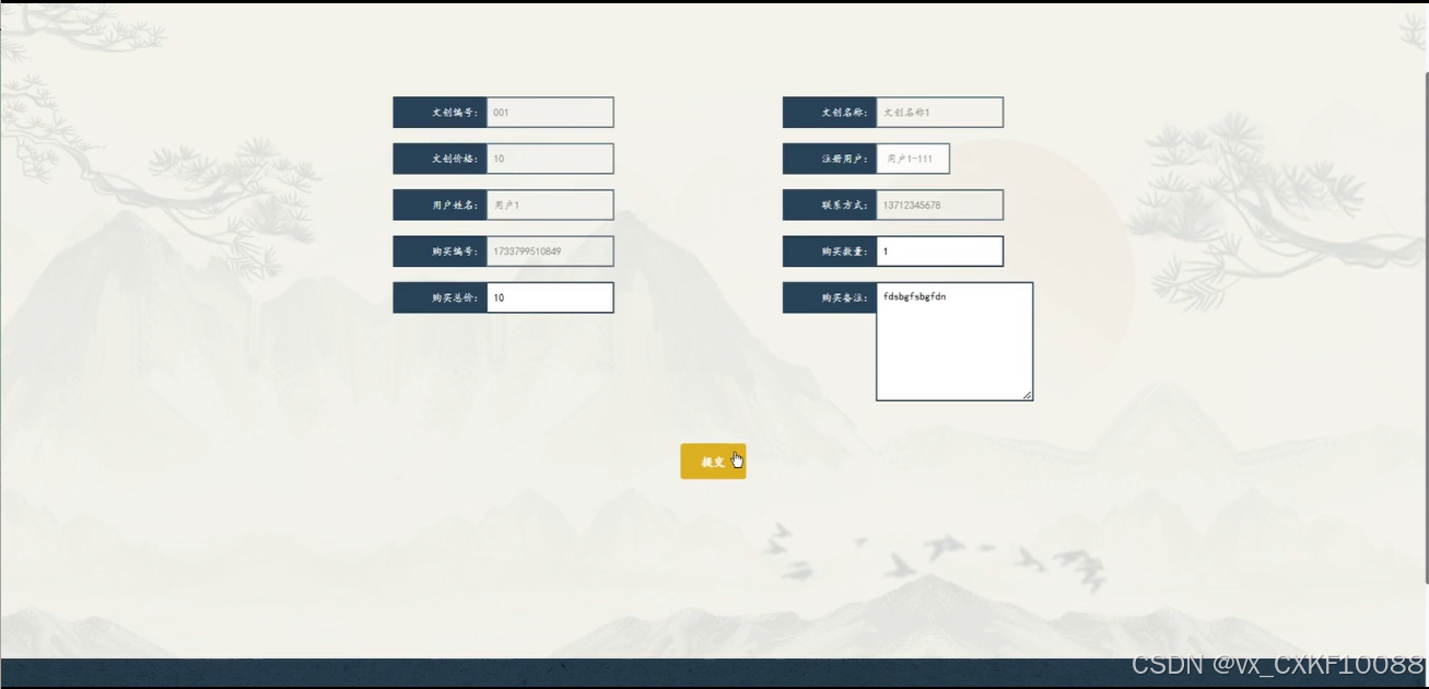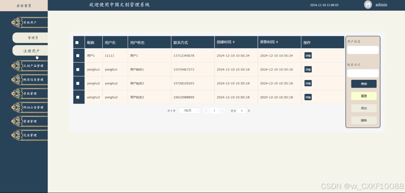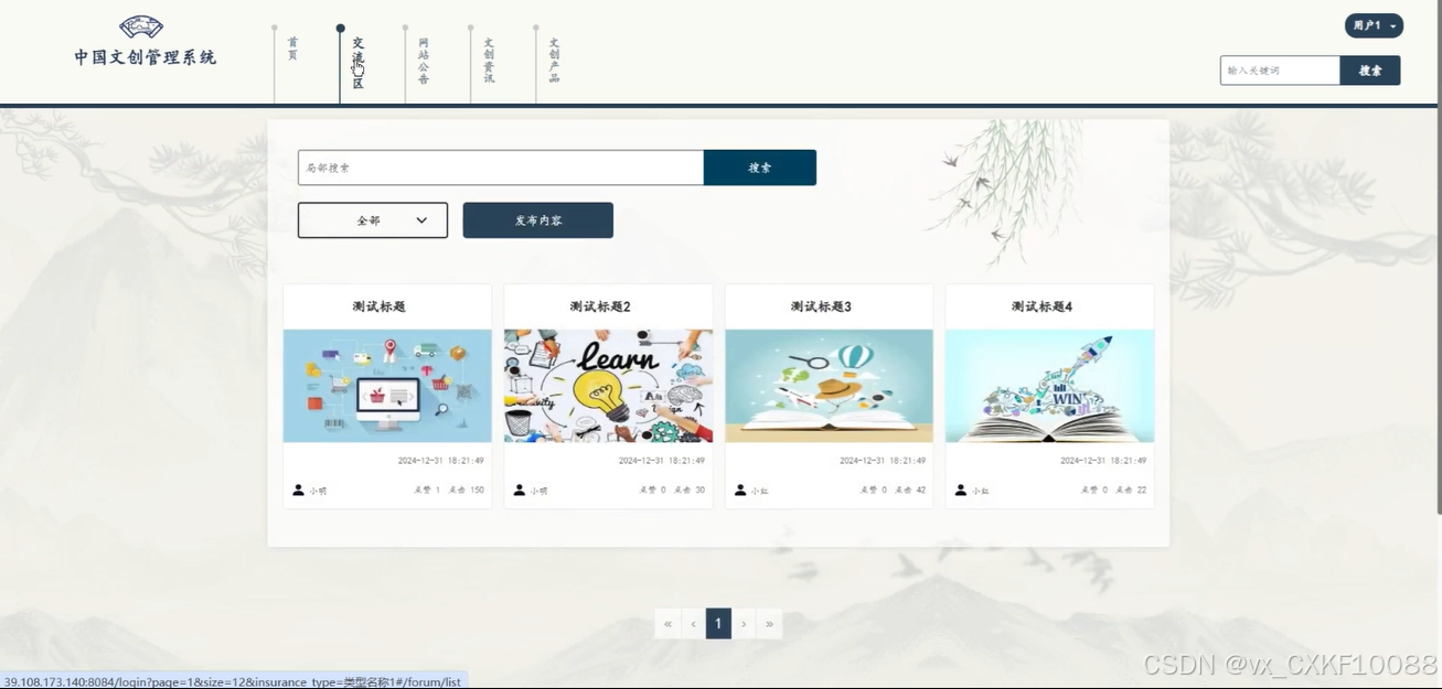 In recent years, China's cultural and creative industry has developed rapidly and become an important component of the country's cultural economy. With the popularization of digitalization and the Internet, the management, promotion and sales of cultural and creative products have gradually shifted to online platforms. In order to better adapt to this trend, cultural and creative enterprises and cultural institutions urgently need efficient management tools to improve the efficiency of product display, transactions, and user interaction. Therefore, the Chinese cultural and creative management system based on the SpringBoot framework has emerged, aiming to provide more intelligent and convenient management solutions for the cultural and creative industry.