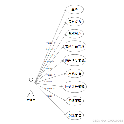 管理员通过后台首页管理个人资料和密码,确保账户安全。系统用户管理模块允许管理员对用户账号进行增删改查操作,维护平台秩序。文创产品管理模块支持添加、编辑和删除文创产品信息,并查看用户评论。购买信息管理模块帮助管理员跟踪用户的购买记录和支付情况,确保交易透明。系统设置模块包括轮播图和公告管理,管理员可以更新重要信息和发布通知。资源管理模块用于管理和发布文创资讯,维护内容质量。交流社区管理模块使管理员能够监督帖子和评论,确保社区讨论健康积极。这些功能共同保障了系统的高效运营和用户体验。详细用例图如图3-2所示。