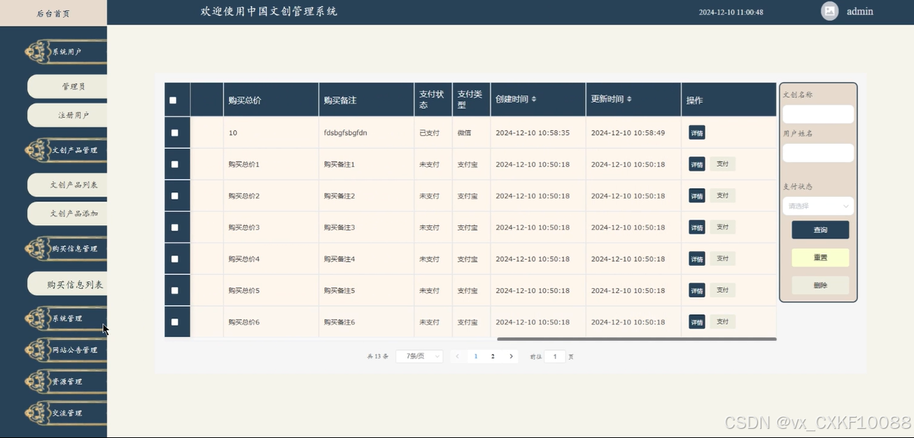 管理员可以查看平台上所有用户的购买信息,并审查支付状态。管理员可以输入文创产品名称、用户姓名或支付状态来查询特定的购买记录,并根据需要对购买信息进行重置、删除或修改等操作,确保系统中的购买信息及时更新和准确无误。如下图所示。