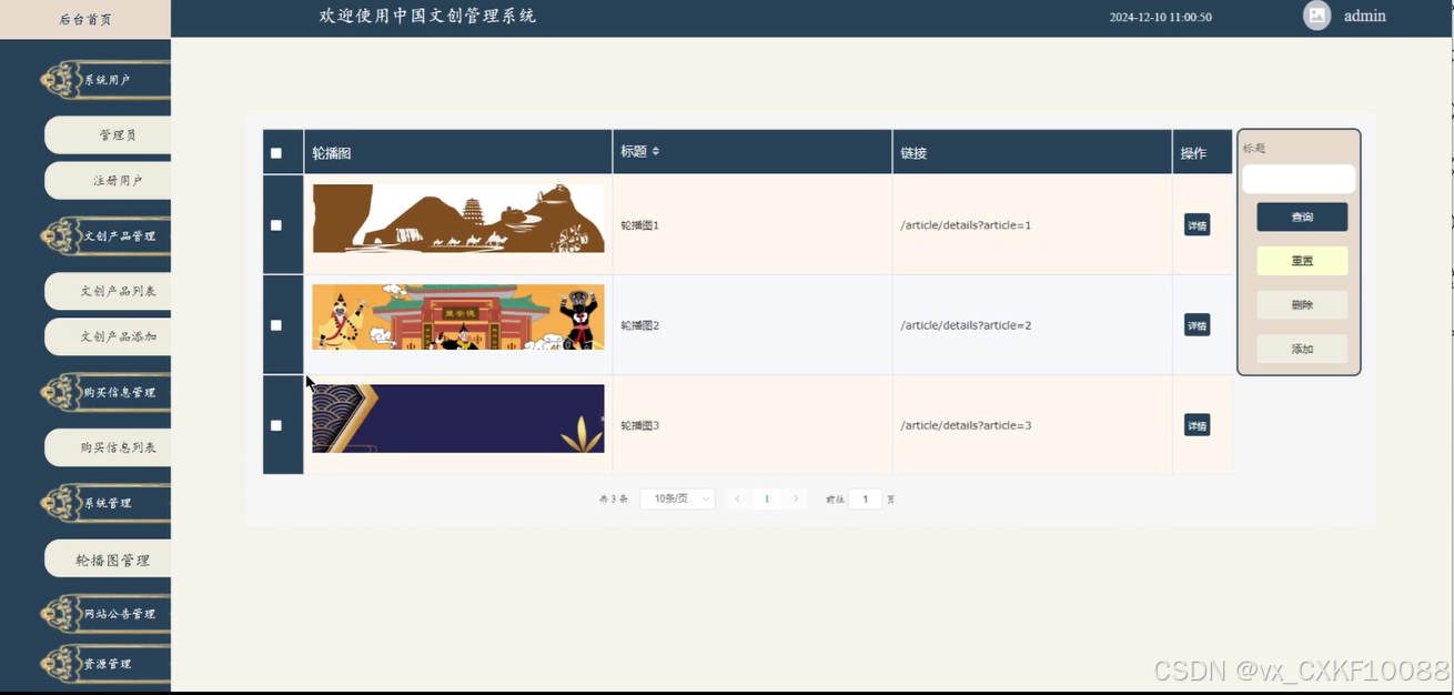 系统管理功能包括轮播图的管理,管理员可以查看当前的轮播图内容,包括图片、标题和链接。管理员可以上传新的轮播图、编辑现有内容或删除不需要的轮播图。通过这一功能,管理员能够确保首页展示内容的新鲜性和吸引力。如下图所示。