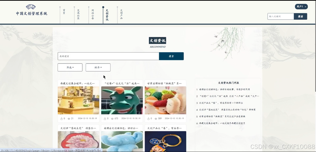 文创资讯:在文创资讯模块,用户可以浏览系统发布的各类文创资讯,了解当前文创领域的最新动态、活动或趋势。用户可以对感兴趣的资讯进行点赞、收藏或评论,也可以通过筛选和排序功能精确查找自己想要的资讯内容。