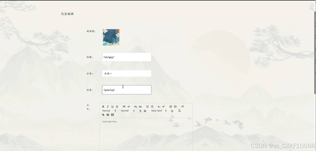 资源管理:管理员负责管理文创资讯及其分类。管理员可以查看文创资讯的详细信息,包括标题、封面图、分类、标签、正文内容等。支持通过输入标题、标签、分类等进行精准搜索,快速定位和管理资讯。管理员可以对资讯内容进行增删改查操作,包括上传封面图、更新资讯正文、修改标签和分类等。管理员还可以管理资讯分类,确保资讯内容合理分类,便于用户浏览和查找。