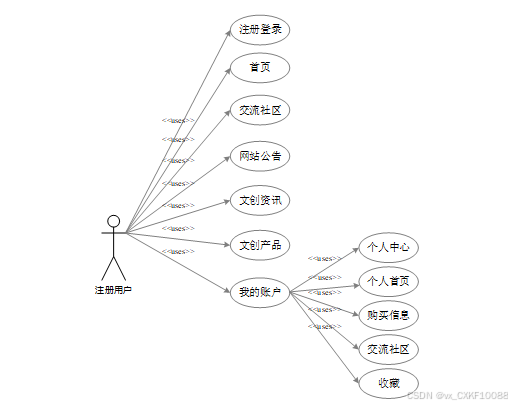 注册用户可以通过系统首页进行全网搜索、浏览导航栏和轮播图,获取最新文创资讯。用户可以在交流社区查看和发布帖子,参与讨论并点赞、收藏和评论感兴趣的帖子。系统提供详细的文创资讯和热门列表,支持筛选和排序功能,用户可以对喜欢的内容进行互动。文创产品页面展示各类产品的详细信息,用户可以根据省份、名称等条件搜索并购买心仪的产品,完成支付流程。个人中心允许用户管理自己的资料、密码、头像等信息,并查看购买记录和个人收藏。通过这些功能,系统为注册用户提供了一个便捷、丰富的文创交流和购物平台。详细用例图如图3-1所示。
