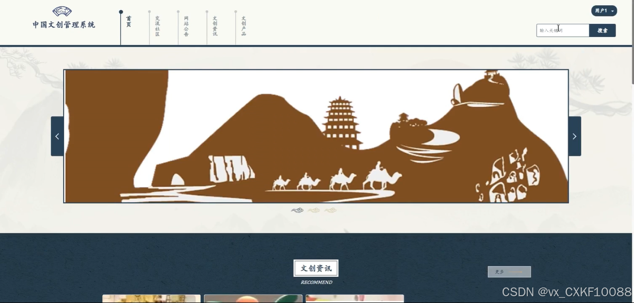 用户进入系统后会看到首页,首页包含了导航栏、轮播图和文创资讯等多种模块。用户可以在首页上输入关键词进行全网搜索,快速找到自己感兴趣的文创产品、资讯或帖子。首页的轮播图展示了系统当前重点推荐的内容,帮助用户了解平台的最新动态和热门信息。如下图所示。
