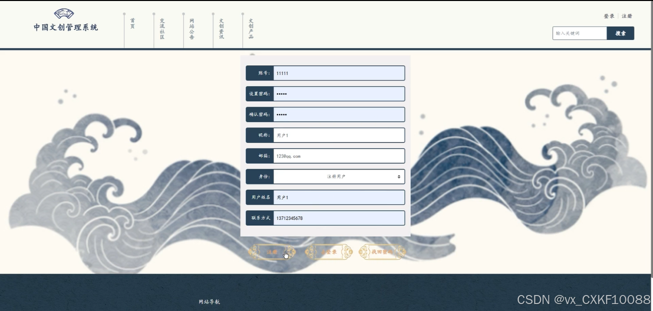 基于SpringBoot的中国文创管理系统旨在提供一个高效、用户友好的平台,满足不同角色的需求。系统支持注册用户和管理员两大类用户,各自拥有特定的功能模块。注册用户可以在首页通过关键词搜索、导航栏和轮播图获取最新资讯,参与社区互动,对喜欢的内容进行点赞、收藏和评论,并管理自己的账户信息,包括修改密码、头像、昵称等。同时,用户可以浏览文创资讯和产品,进行购买操作并查看个人购买记录。管理员则具备更高级别的权限,用于全面管理和维护系统,功能包括后台首页管理、系统用户管控、文创产品管理、购买信息管理、系统设置(如轮播图和公告管理)、资源管理和交流社区管理。管理员可以通过这些模块对用户账号进行增删改查操作,确保系统的安全性和规范性;添加、编辑和删除文创产品信息,查看用户评论;跟踪用户的购买记录和支付情况;更新轮播图和发布公告;管理和发布文创资讯;监督和维护社区内容,确保健康积极的讨论环境。通过这些综合功能设计,系统不仅提升了用户体验,还增强了平台的管理和维护效率,确保了数据的安全性和隐私保护,为文化创意产业的发展提供了强有力的技术支持。主要功能如下: