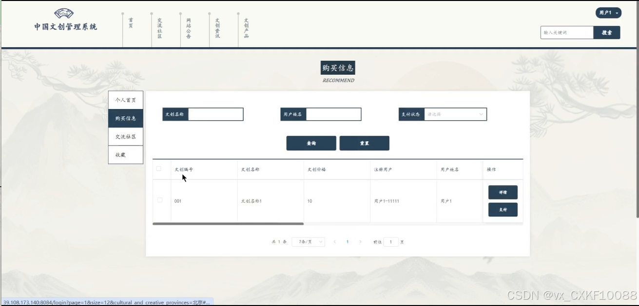 在购买信息模块,用户可以查看自己购买的文创产品详情和支付状态。用户可以根据文创名称、姓名或支付状态进行查询,方便了解历史购买记录和对当前产品选择支付方式进行支付。用户还可以通过此页面进行页面重置和搜索,确保所有信息的准确性。如下图所示。