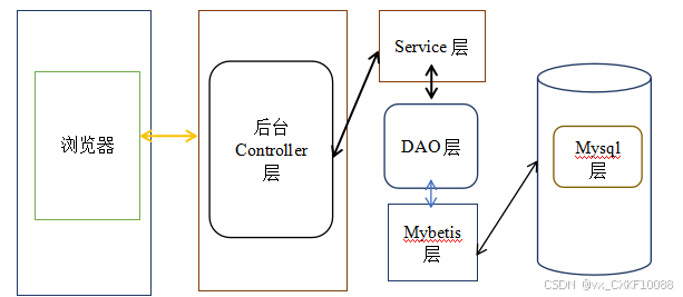 具体交互流程为:浏览器中执行具体操作,操作命令将生成一个do方法。该方法使得浏览器能够访问后台中的Controller层,Controller层由于业务上的需要执行进而访问Service层。Service层收到指令后将会去调用内部DAO层的接口。接口将会和MyBatis层下的一个SQL语句相对接。对接好之后进而访问MySql数据库。更新底层数据,然后将数据同步回MyBatis层,同步变化后的数据将通过DAO层接口,Service层和后台Controller层,直观反映到浏览器页面上。