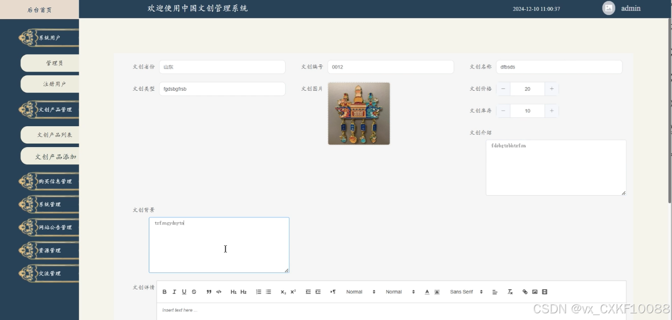 文创产品管理:管理员可查看前台展示的各类文创产品详情,包括产品名称、类型、价格、库存、描述、评论等信息。管理员可通过文创产品的省份、名称等信息进行搜索,快速定位特定产品。除了查看,管理员还可以进行文创产品的添加操作,输入产品的编号、名称、类型、价格、库存等信息,上传图片并写入产品的详细介绍。这确保了前台展示的文创产品信息的准确性和及时更新。