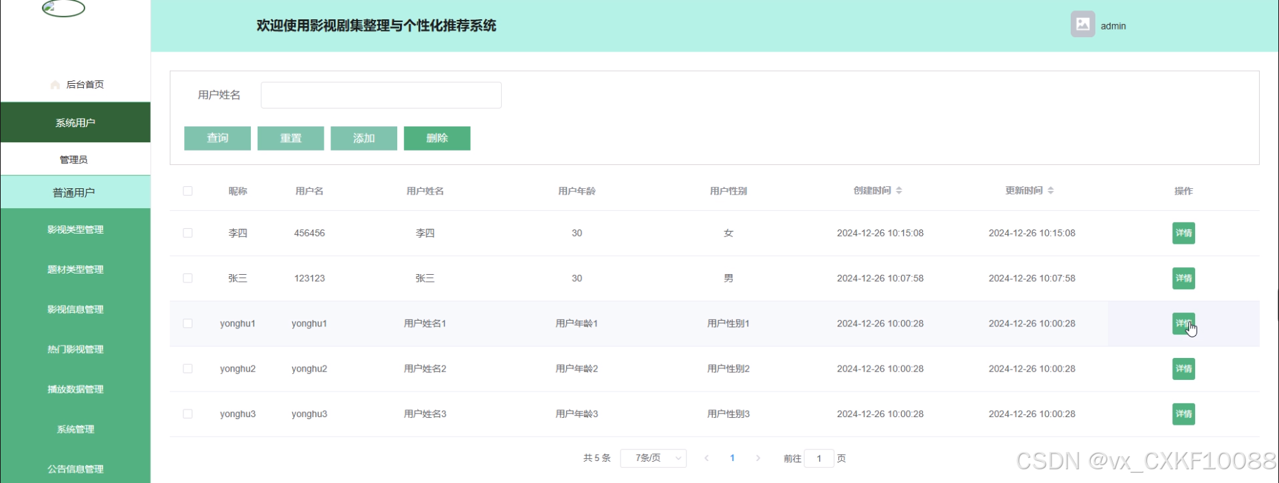 The system aims to utilize advanced information technology to integrate dispersed film and television resources, and provide personalized recommendation services to users through data analysis. For ordinary users, the system provides basic functions such as registration and login, homepage display, announcement information viewing, film and television information browsing, film and television information query and online viewing, popular film and television recommendations, and personal information management. Users can not only collect movies or leave comments according to their preferences, but also enjoy customized recommendation services based on their personal browsing history, greatly enhancing the viewing experience. In addition, the administrator function covers comprehensive operations from user management to film and television information maintenance, including but not limited to the management of film and television genres and themes, updates of popular films and television shows, playback data statistics, slideshow settings, announcement information release, and permission control, ensuring efficient system operation and timely content updates.