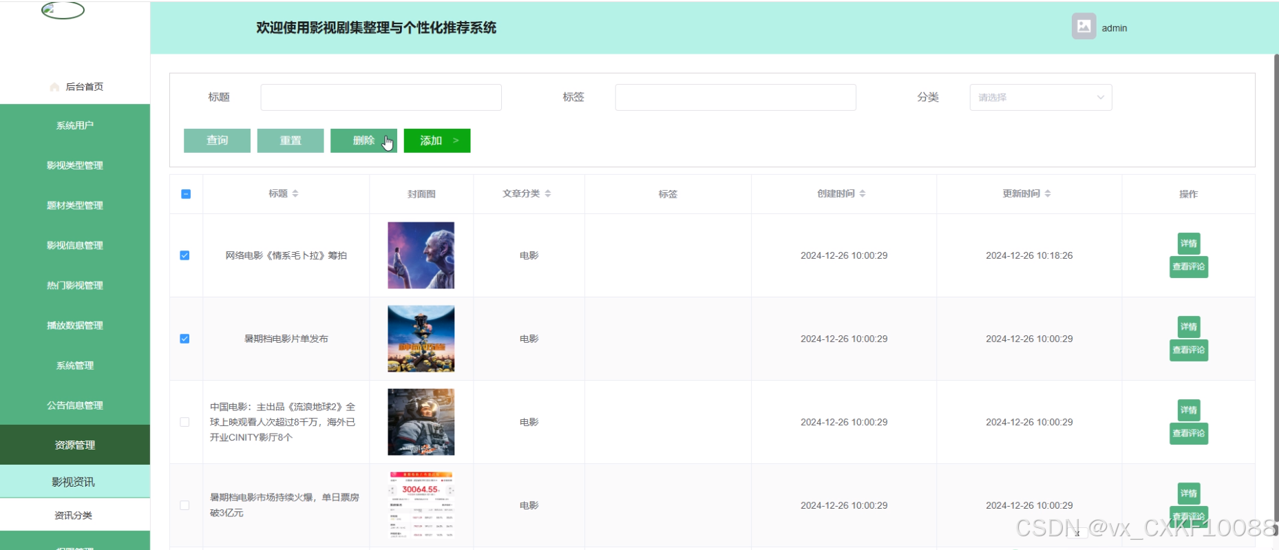 在该模块管理员可以对影视资讯和资讯分类信息进行增删改查操作。例如,点击“影视资讯”进入页面后,管理员可以通过点击某条资讯后的“详情”按钮查看该资讯的具体内容,或通过“查看评论”按钮浏览用户对该资讯的评论。以影视资讯为例,其界面图如下图5.14所示。