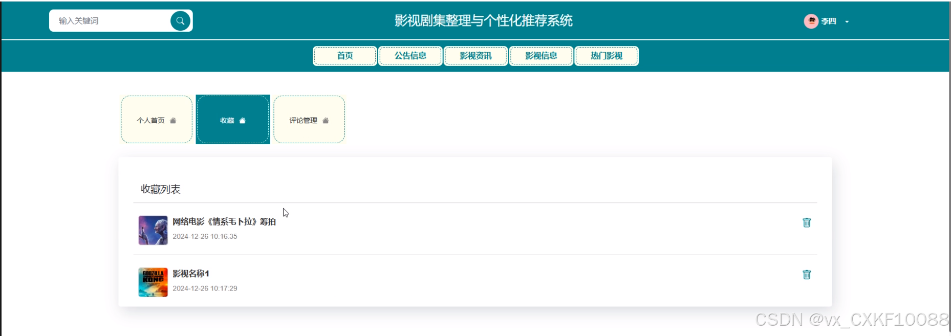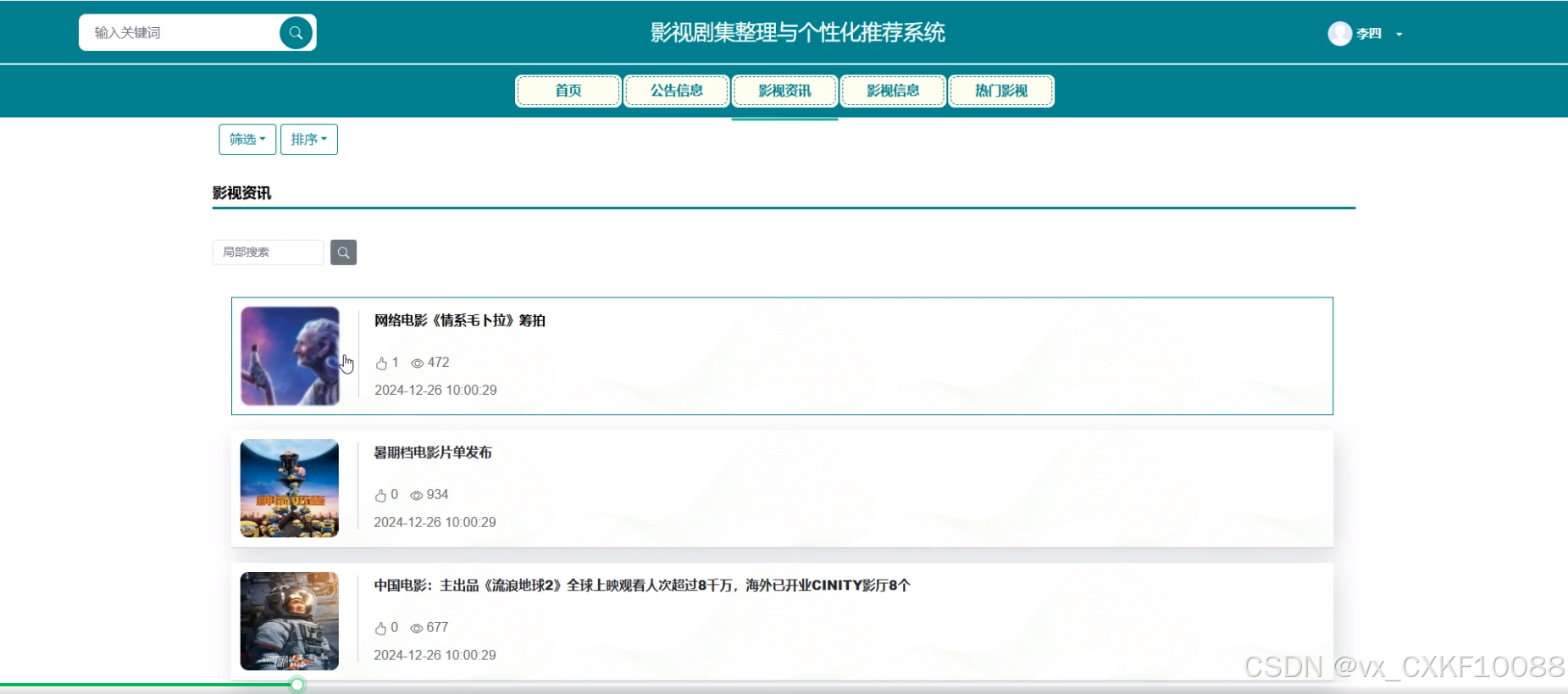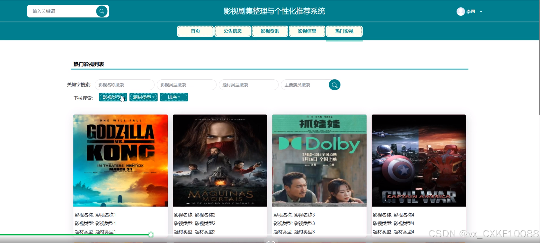 在国内,影视剧集整理与个性化推荐系统的研究正逐渐成为热点,研究重点主要集中在提升推荐算法的准确性、优化用户体验以及探索新的技术框架等方面。张华欣、韩霄萌等人采用Java语言开发结合MySQL数据库技术,开发设计出基于协同过滤算法的影视平台推荐系统[1]。该系统的前端和后端模块设计为影视剧集整理与个性化推荐系统提供了重要的参考,特别是其前端包含的个性化推荐模块,对于提高用户满意度具有重要意义。